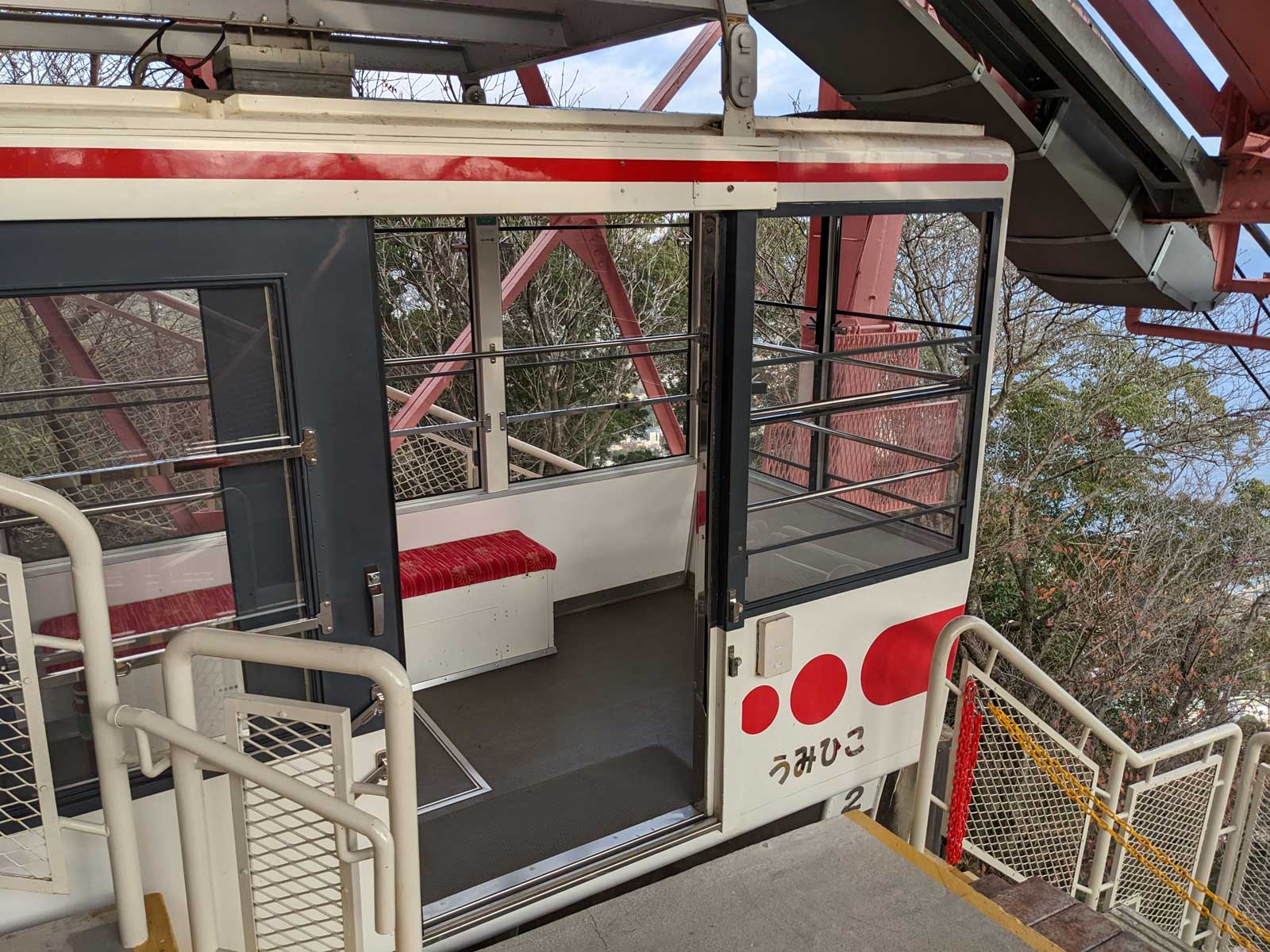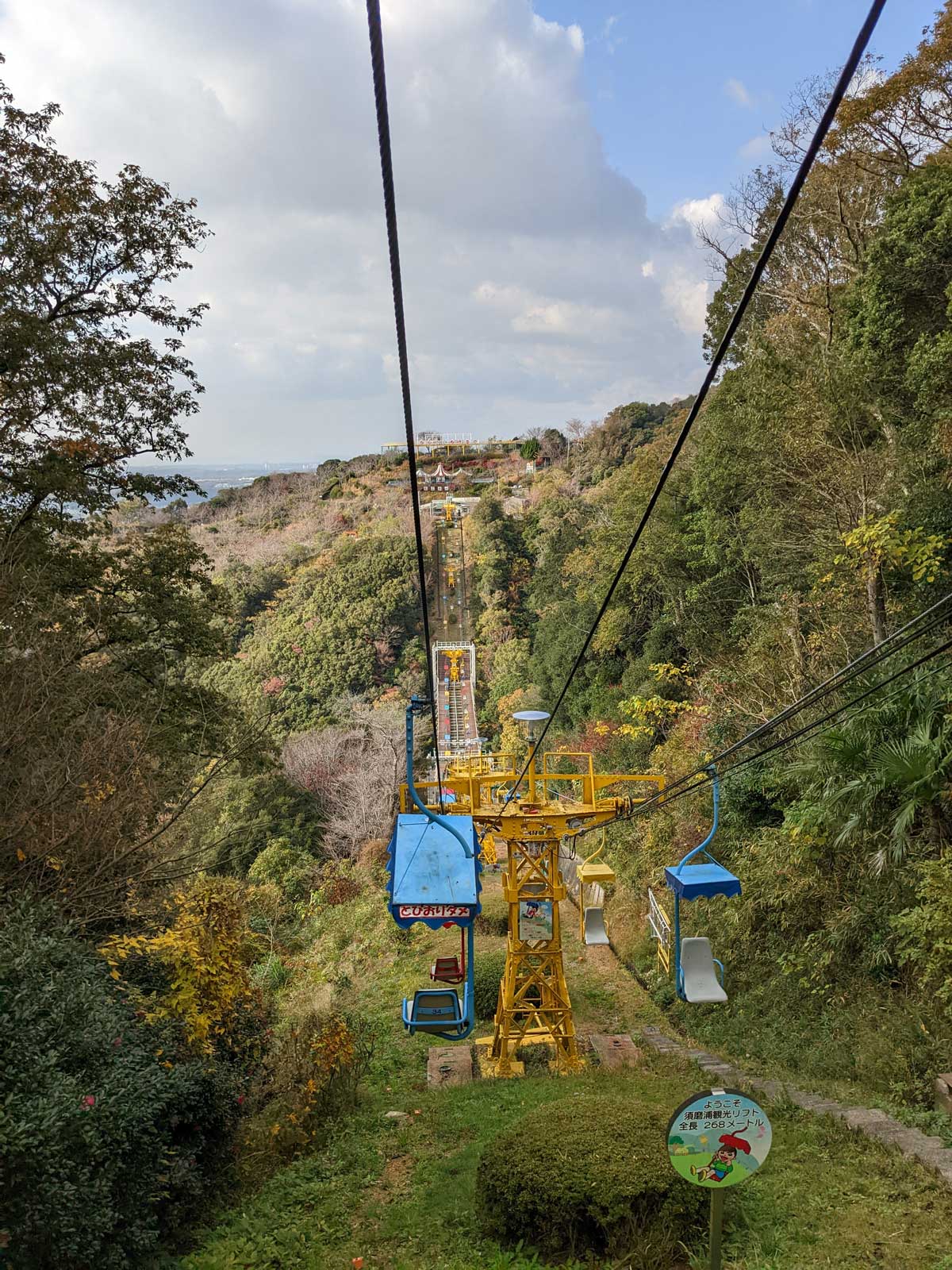 次は「須磨浦公園」へ。 何度も前を通ったことはあるが一度も行ったことがない。 ロープウェイなど3種の乗り物の往復チケットを1,800円で購入。 ロープウェイはぐいぐいと上がっていき、海の方に素晴らしい景色が見えた。 ロープウェイ降りてからは「カーレータ」「リフト」と乗り継いでいく。 そこから旗振山というところまで10分ほどで上がれた。 全体的に寂れていて平成初期の施設が廃墟になった感じだった…