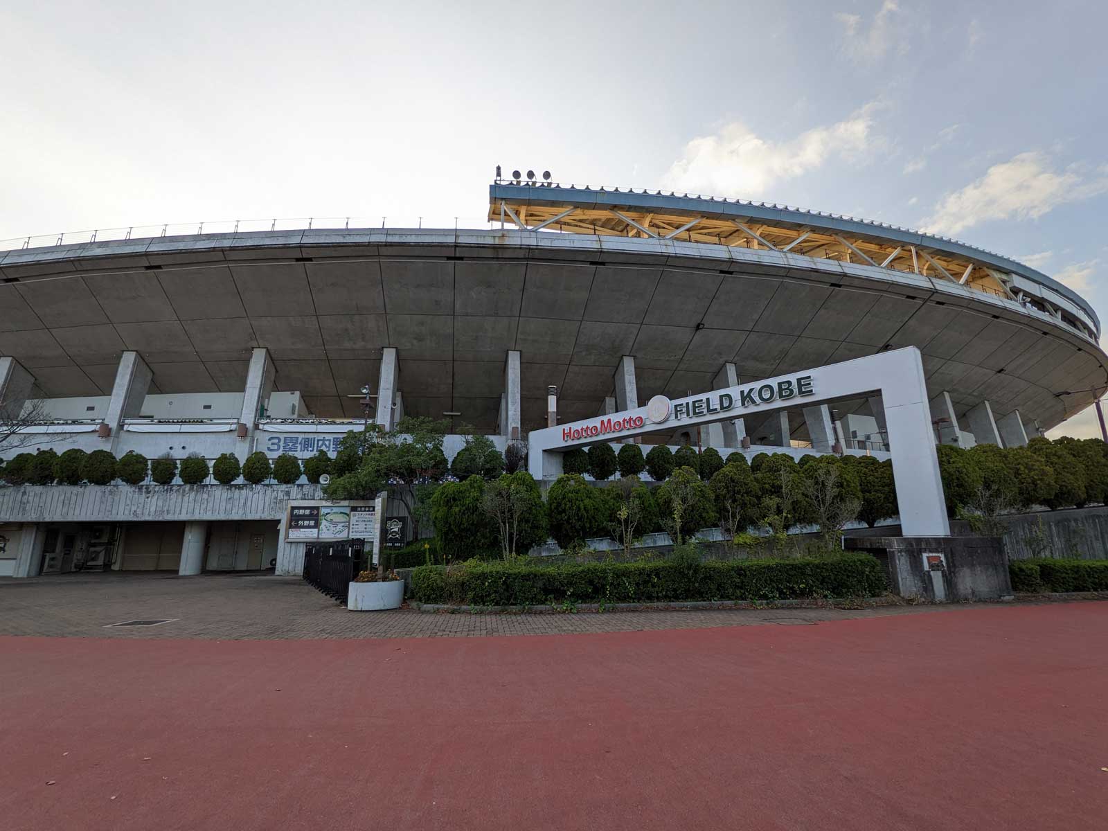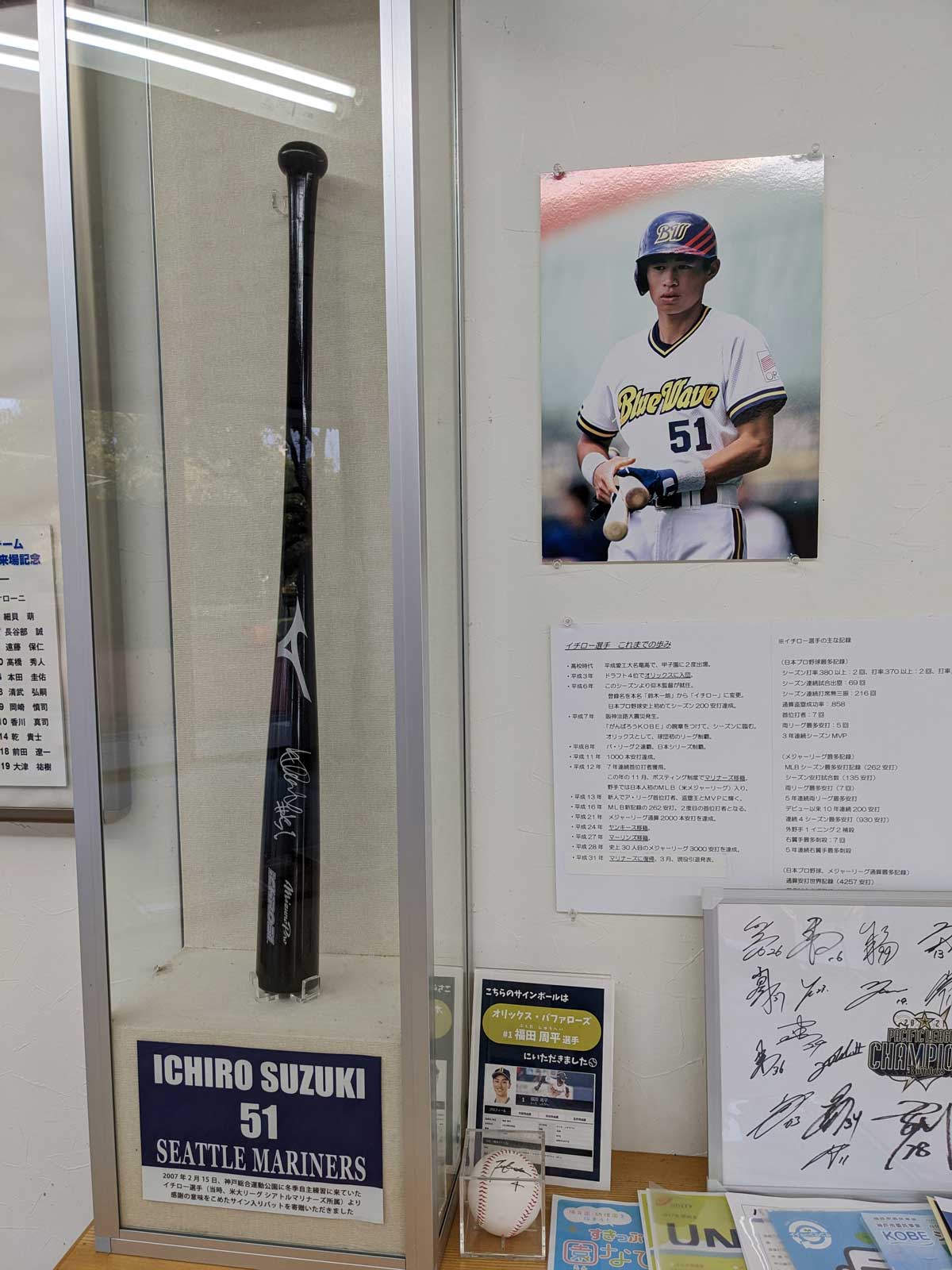 そして「神戸総合運動公園」へ。 ここには野球場の「ほっともっとフィールド神戸」がある。 今は合併してしまったけど、オリックスブルーウェーブという野球チームの本拠地だった場所。 オリックスには、あのイチローが所属していた。 球場の中に入ることはできなかったけど、案内所にはイチローのサイン入りバットが飾ってあった。
