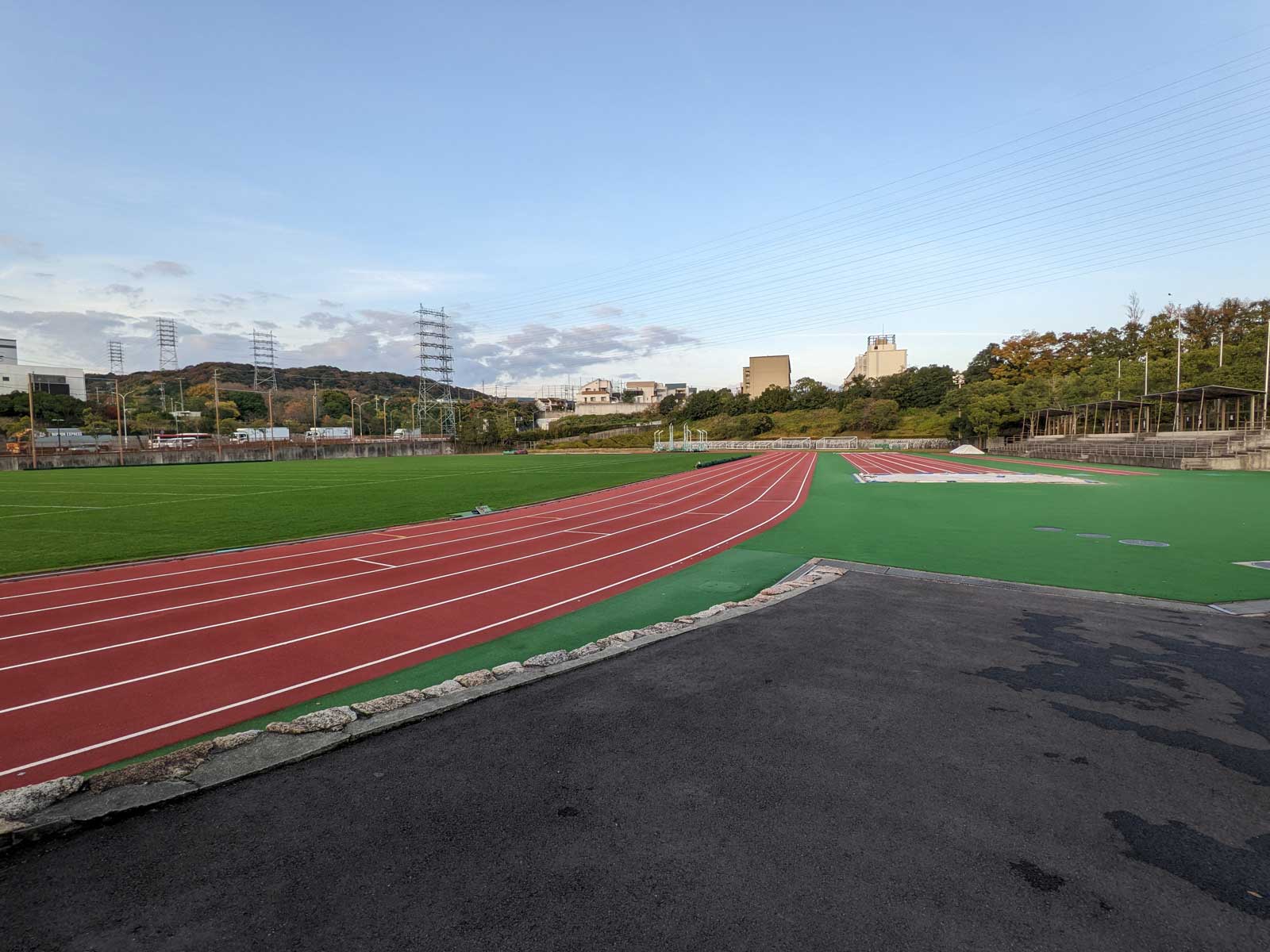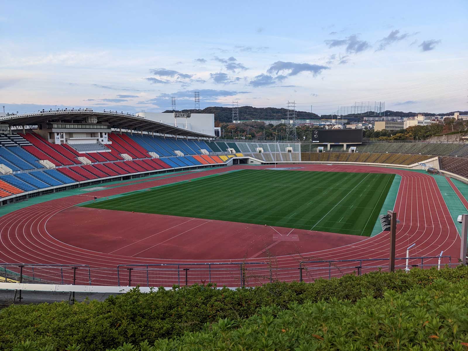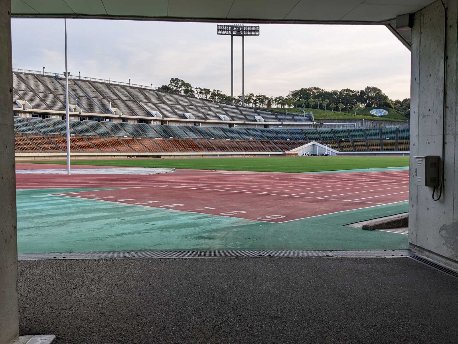 すぐ横には「ユニバー記念陸上競技場」がある。 ここも入ることはできなかったけど、隙間から中を覗いたのと、さらに横にある補助競技場を見てきた。
