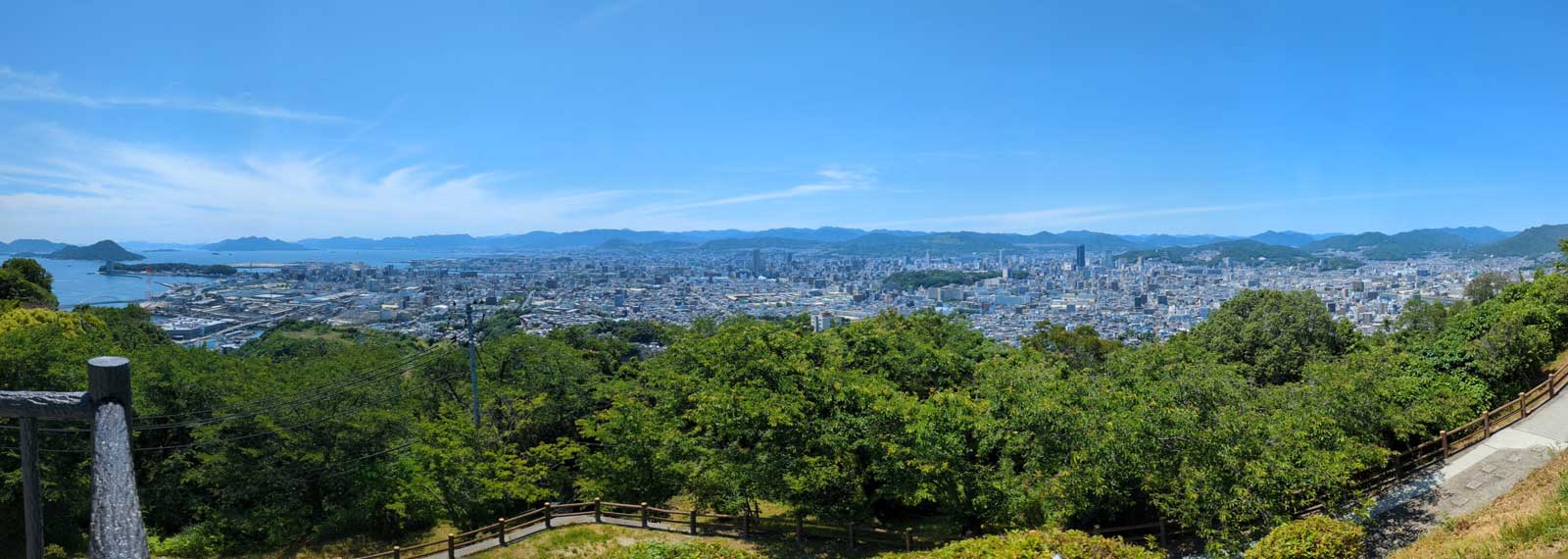 黄金山の展望台からの眺めは最高だった。 360度見渡せる大パノラマ。 南は瀬戸内海、東にはマツダ本社や工場が立ち並ぶ。 北は街が見えさらに奥には山まで見える。 西の景色は圧巻で、広島駅周辺~平和公園の方まで、広島市の中心部を一望できる。 これはすごい景色だ。