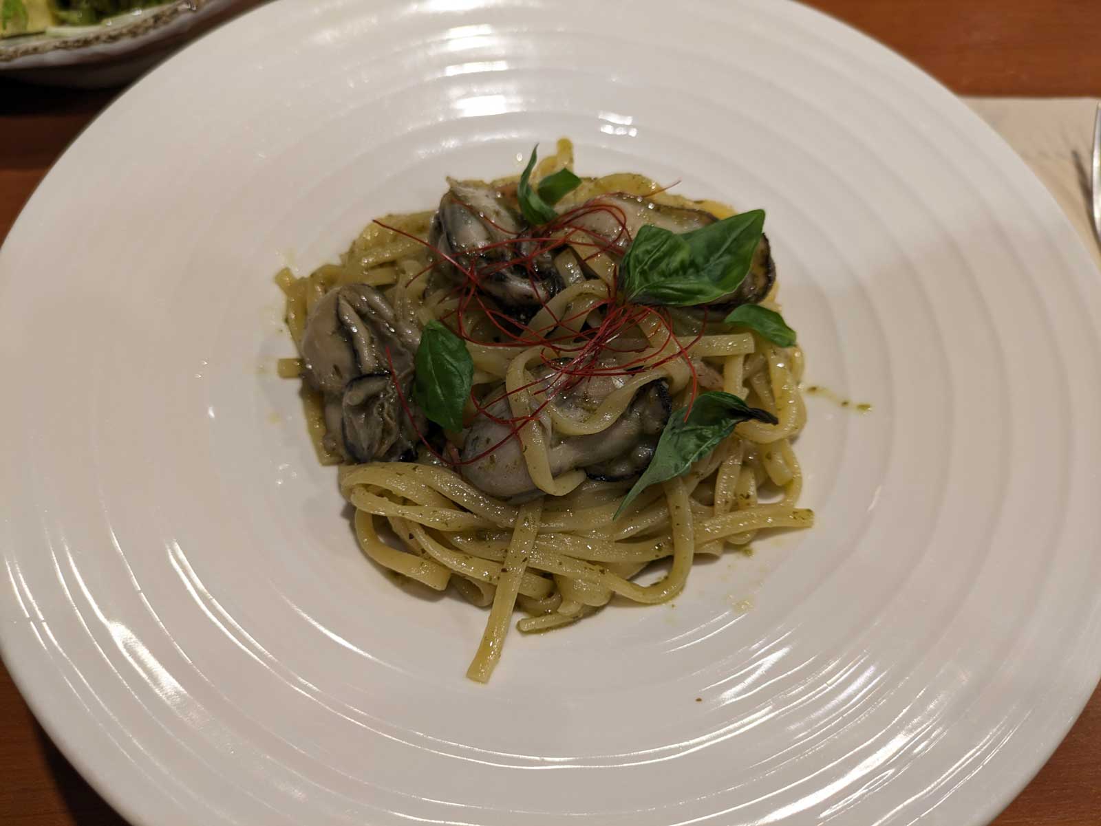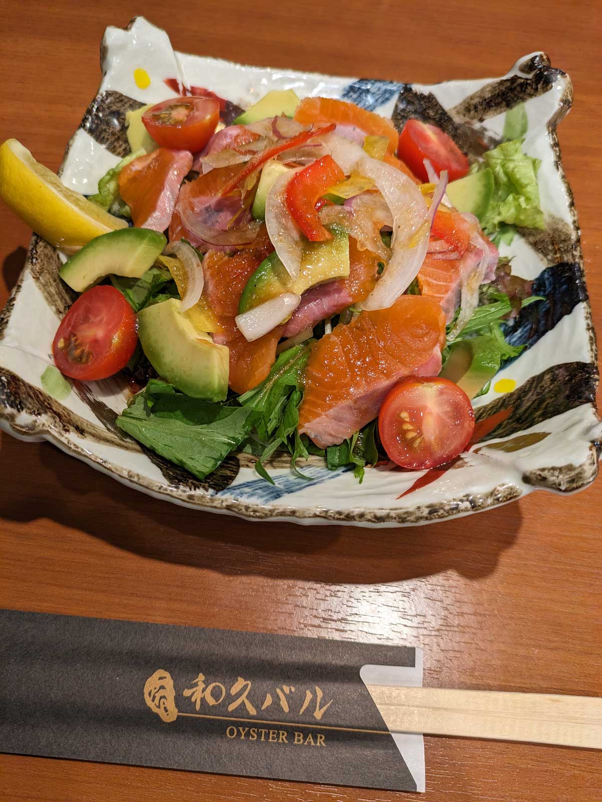 入口近くにあった「和久バル」で牡蠣のオイルパスタ、レモンサーモンのサラダ、ビールを楽しんできた。