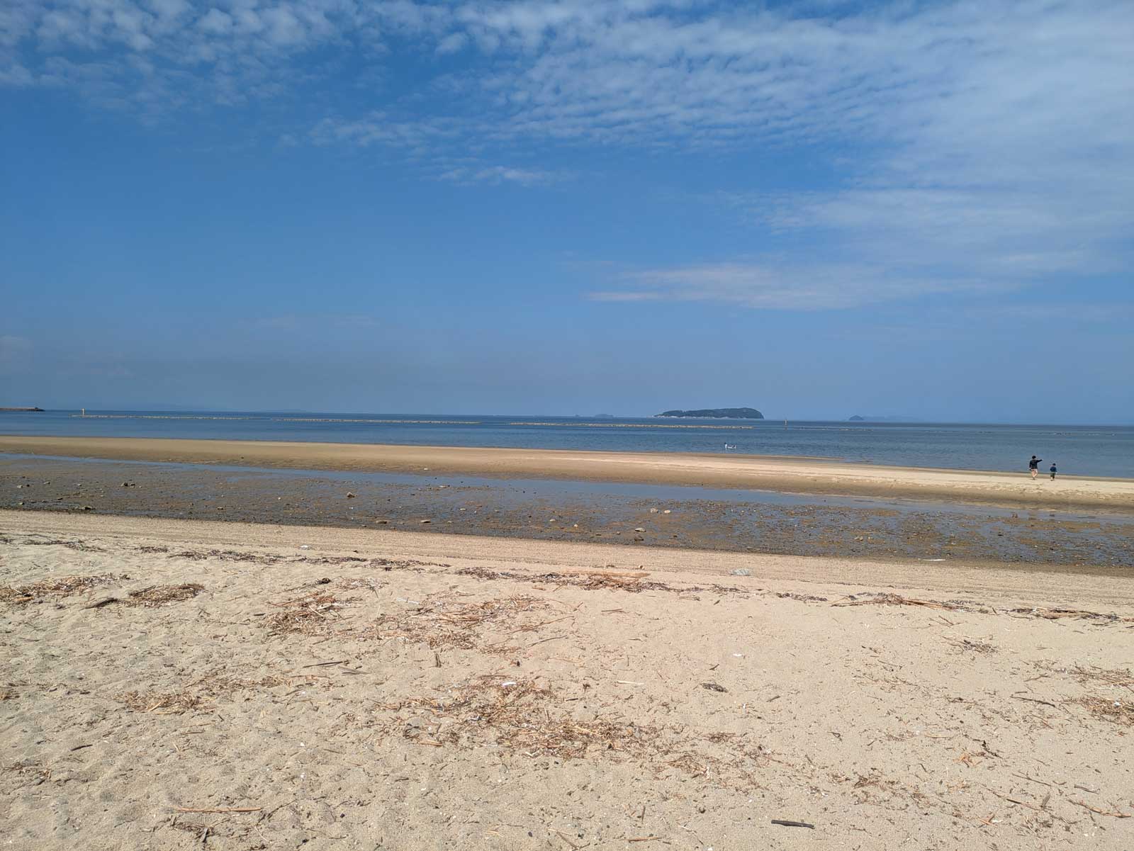 高松西ICから高速道路で豊中ICまで。 高速道路下りて20分ほどで有明浜に到着。 午前9時の有明浜はガラガラだった。 まだ3組しか海で遊んでいなかった。