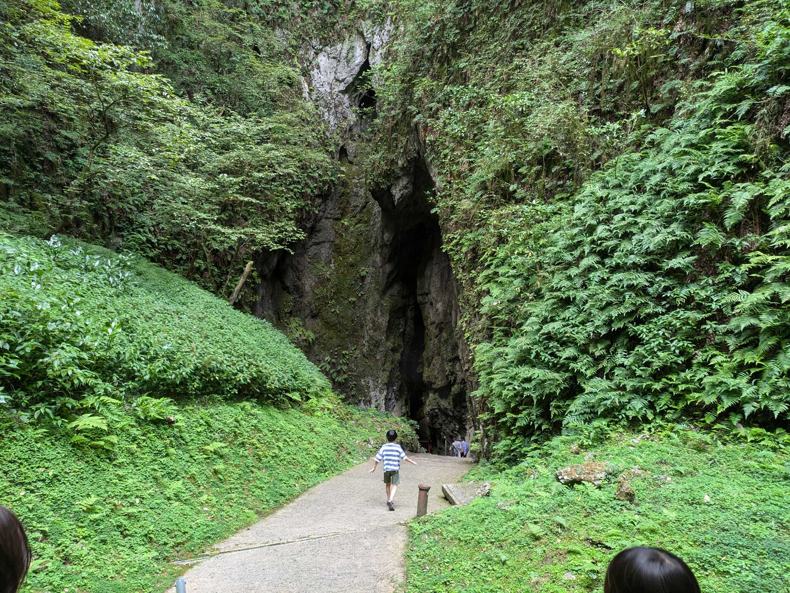 鍾乳洞の入口は、チケット売り場から数分下に下ったところにある。 入口が見えてくるにつれて、不満げだった2人が楽しそうになってきた。 見上げるような岩の下部に開いた入口、入口からは冷気が漏れてきて、入口付近はひんやりとする。