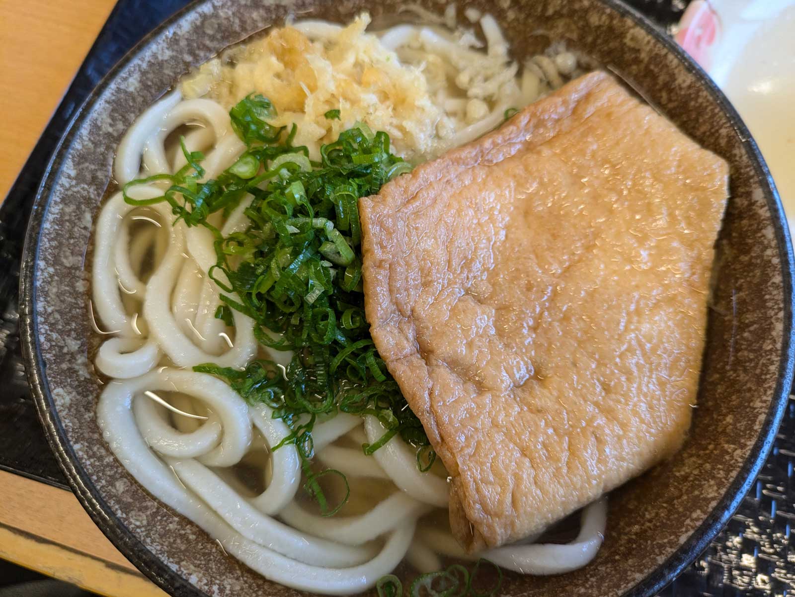 今日は小学校の授業参観だったので昼過ぎに小学校へ。 「車じゃなくて徒歩で」と案内が来ていたので歩いて向かう。 まだお昼ごはんを食べてなかったので、「こがね製麺所」できつねうどんを食べる。 香川のうどん屋で「きつねうどん」というメニューを提供している店はそれほど多くない。 だけど自分できつねうどんを作ることはできる。 基本的には「かけうどん」を注文して、天ぷらコーナーに油揚げがあるので、それをトッピングする。 なのでメニューにはないけど、だいたいどの店でもきつねうどんは食べることができる。