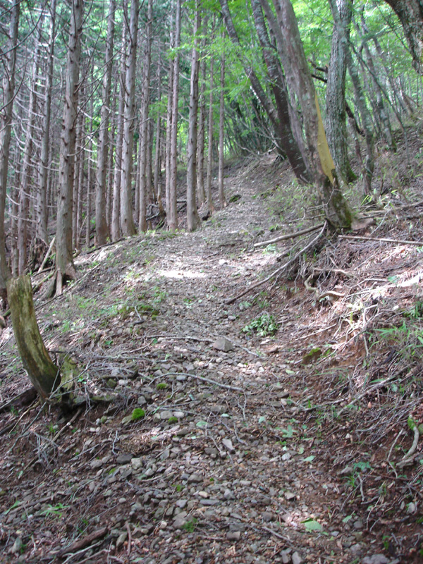 この山道はひたすらキツイ。 ホントにキツイ。 傾斜がずっと急。 景色も全く見えない。 休憩できそうな場所もない。 ただひたすら急傾斜を登っていくのみ……