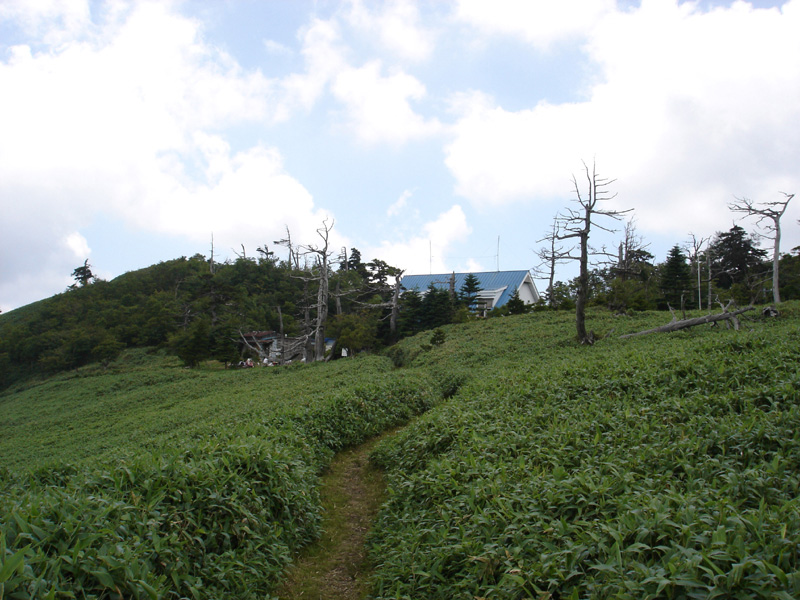 しばらく歩き、樹林帯を抜けて笹原に出たら、ヒュッテはすぐ近く……と思っていたのだが、笹原に出てから15分くらい歩いたな… ようやくヒュッテが見えてきた。