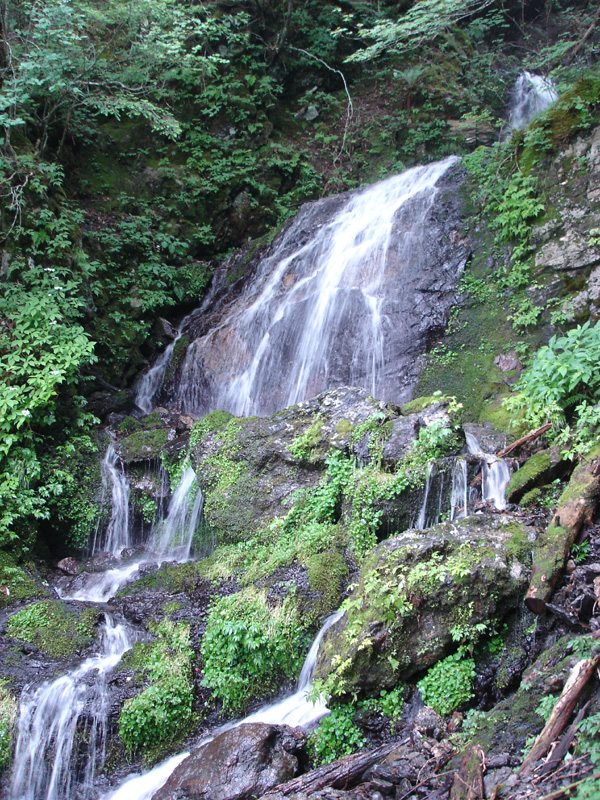 こんな道を歩くこと1時間……つらすぎる……そして、ようやうく追分まで到着した。 ここから、さらに1時間半の下りがある…… しかも傾斜が急になる…… ここで別パーティと遭遇した。 このパーティも富士の池登山口から登ってきたらしいけれど、神社まで車で登ってきたので、オレより登りの時間が1時間短く、下りの時間も1時間短い…… はぁつらい。。。