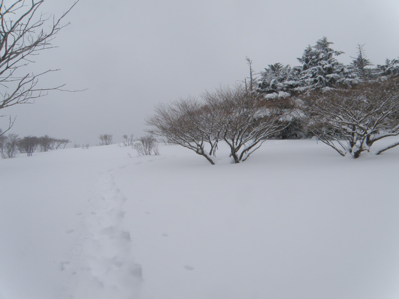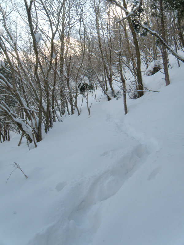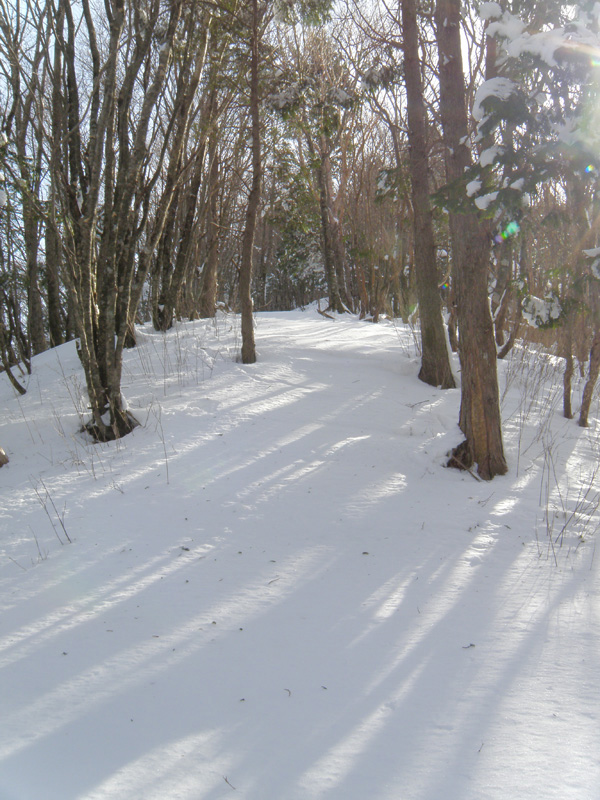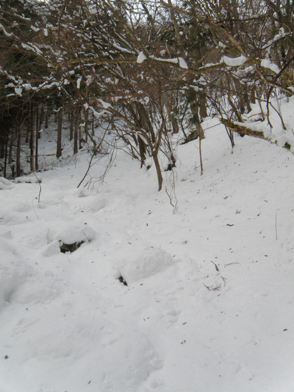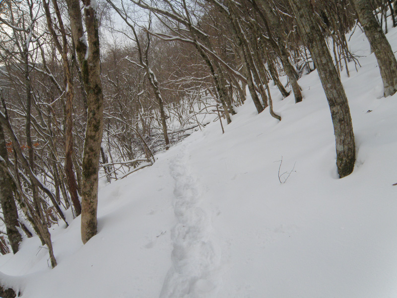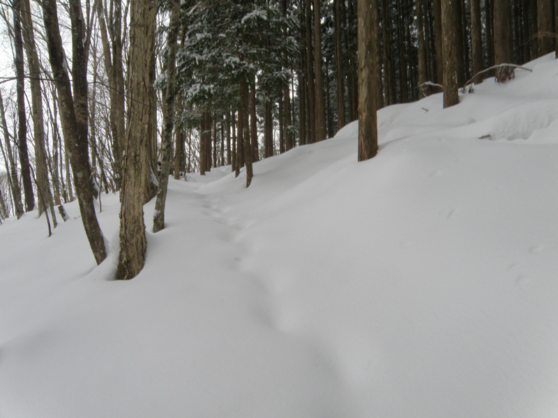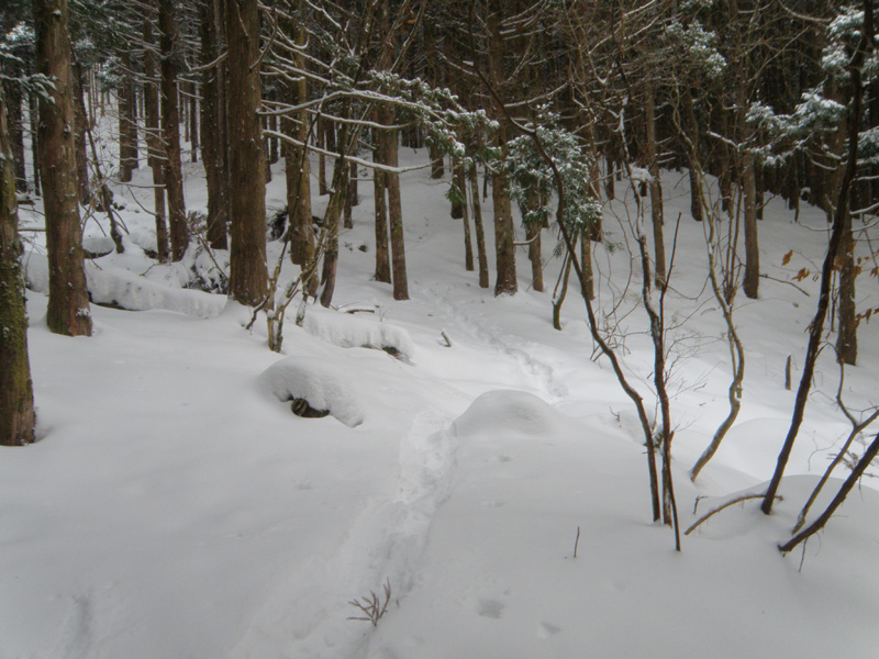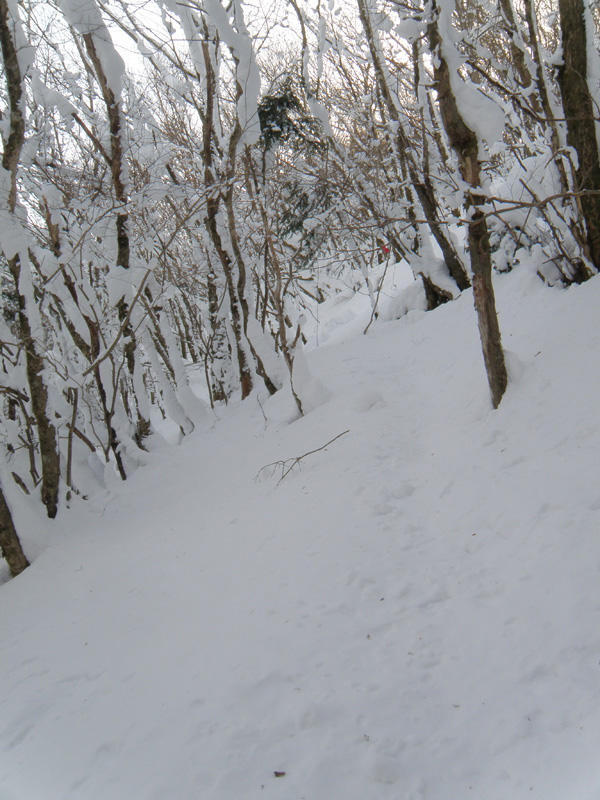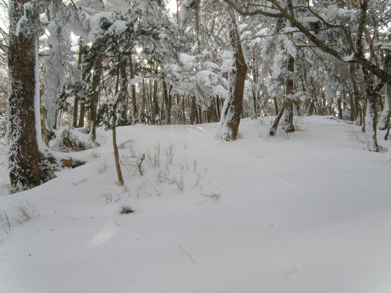 50mほど下り、再び登り。 この辺りで、地面に氷の粒が落ちているのを発見。 どこでも落ちている訳ではなく、木の下に落ちている場合がほとんどなので、霧氷かな。