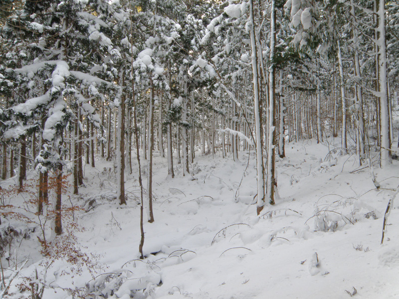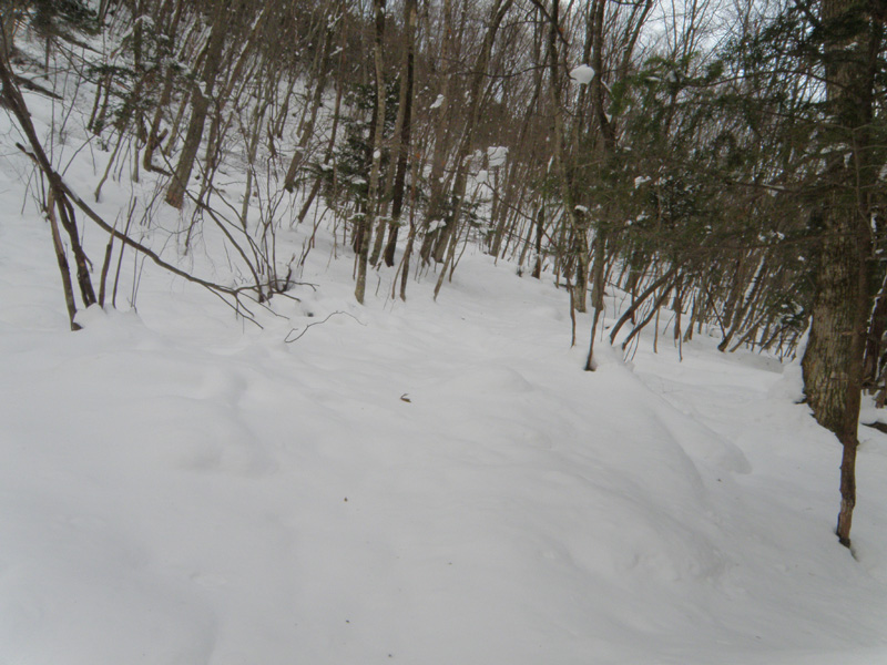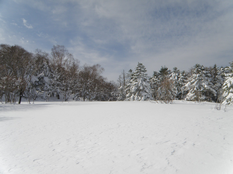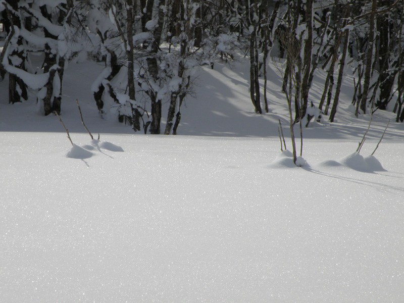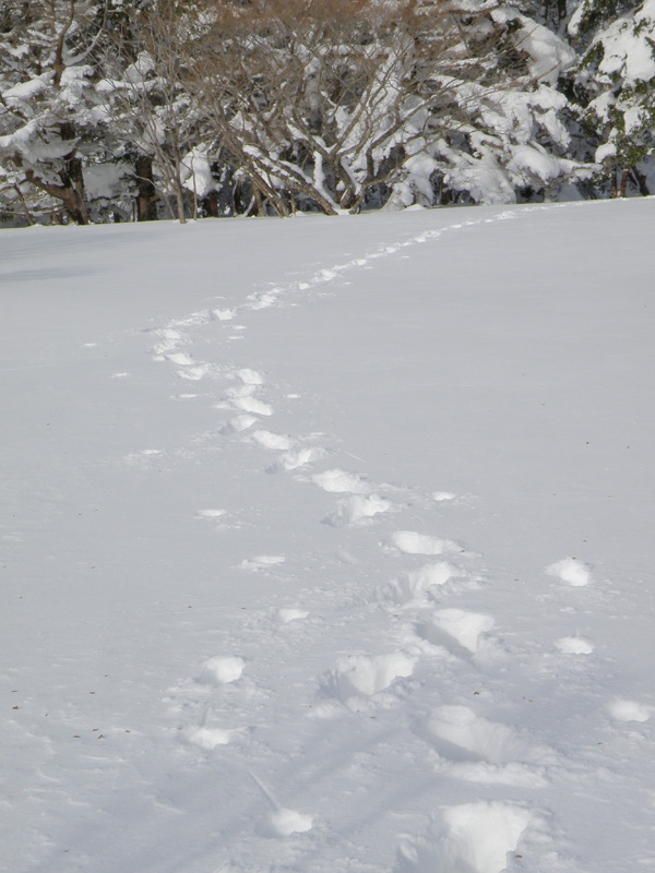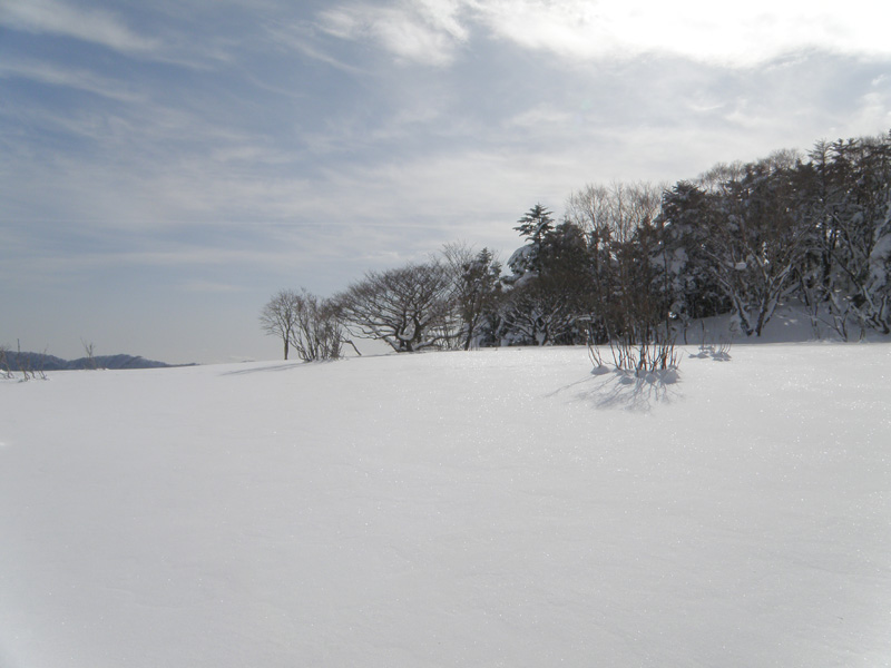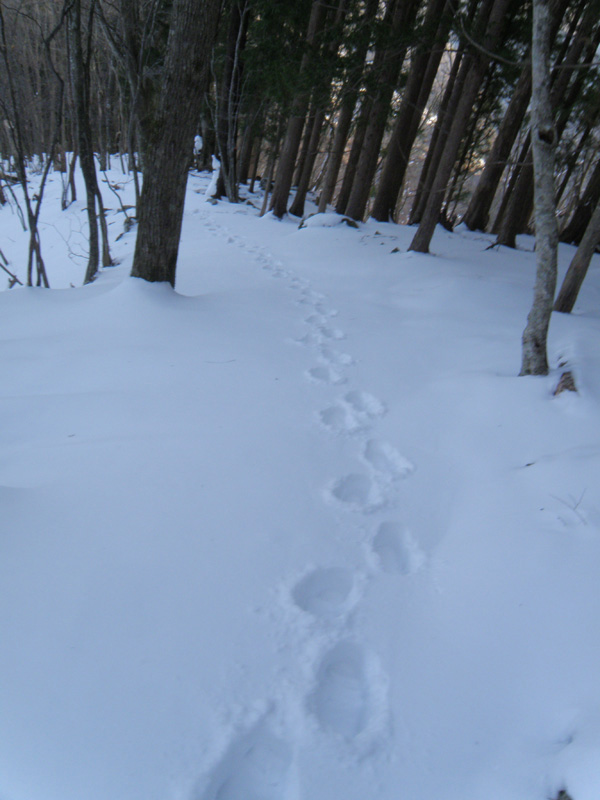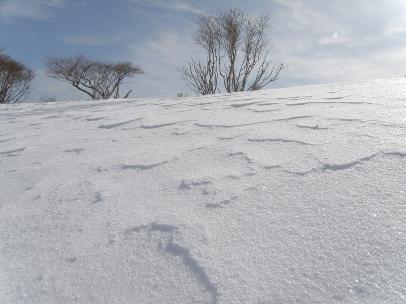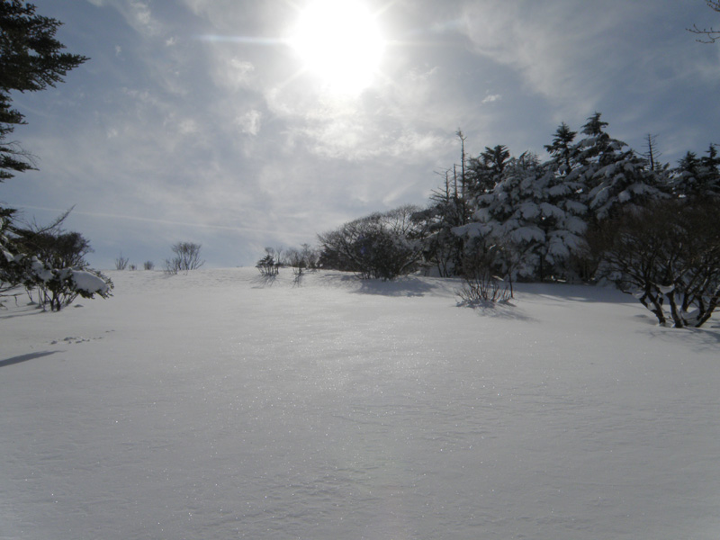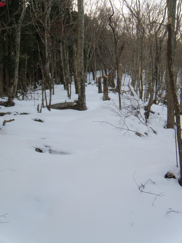50mほど下り、再び登り。 この辺りで、地面に氷の粒が落ちているのを発見。 どこでも落ちている訳ではなく、木の下に落ちている場合がほとんどなので、霧氷かな。