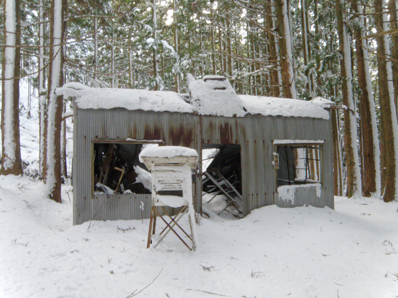 モノレールと並行して歩く道に出て、急傾斜の道を歩き、モノレールのレールをくぐる。 そしてしばらく歩くと、旧造林小屋に到着。 コースタイムの区切り地点なので、ここで少し休もうか。
