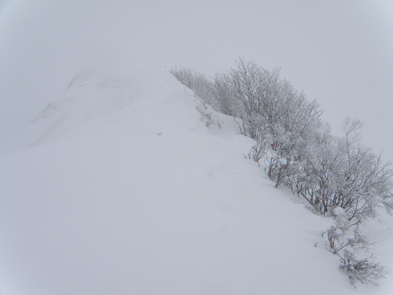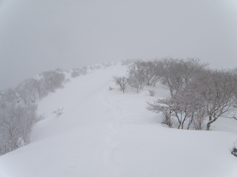 ここからもそこそこの傾斜の道が続く。 樹林帯を抜け、笹原に出る。 笹は微妙に濡れている…… 牛ノ背が見えるのだけど、やっぱり視界が良くないなぁ。