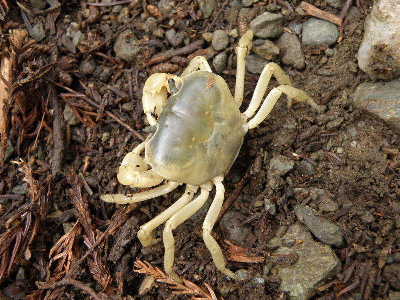 とりあえず川を渡るところを目標に……川を越えたあとは「あと300m」と意識して岩原に到着。 時刻は既に18時15分。 あたりは薄暗くなってきた。 木々がなかったらまだけっこう明るいのだが、森の中なので暗い。