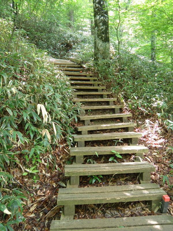 木の階段の続く道をひたすら登っていく。 5分ほど木の階段がなくなり、平坦な道を歩くが、またすぐに木の階段が出現。 つらいなぁ……