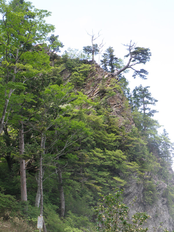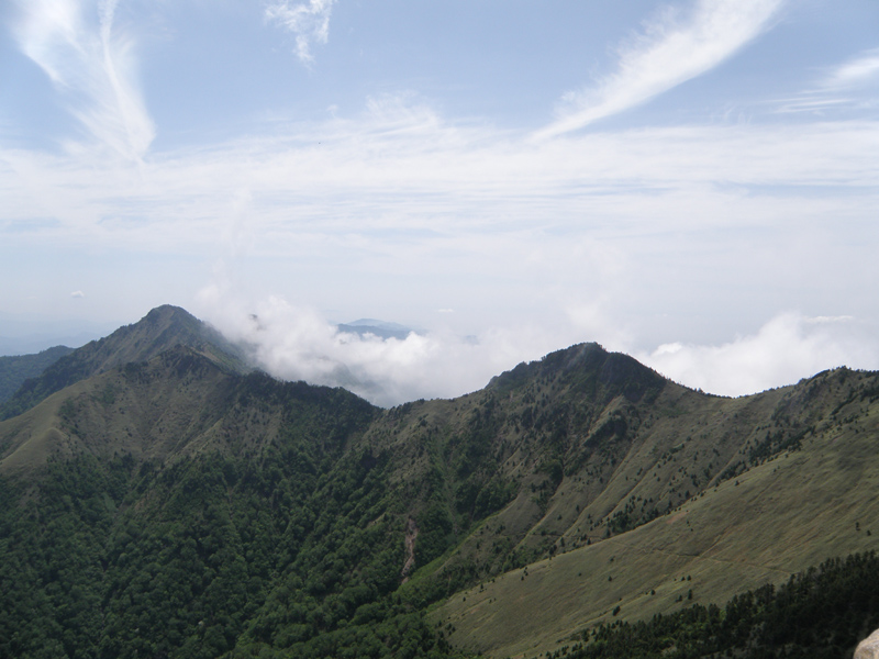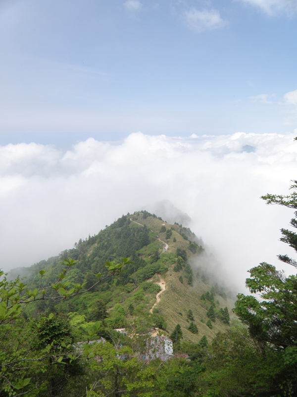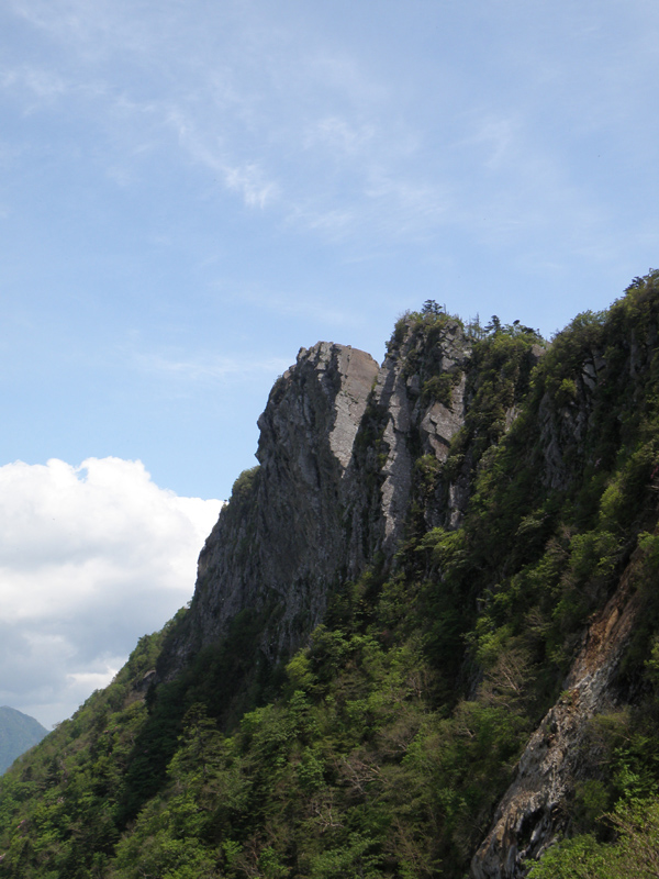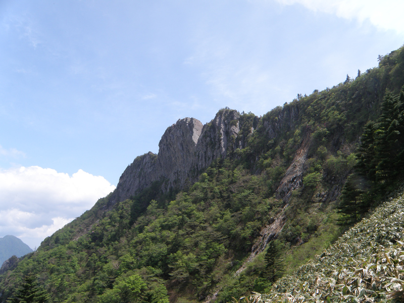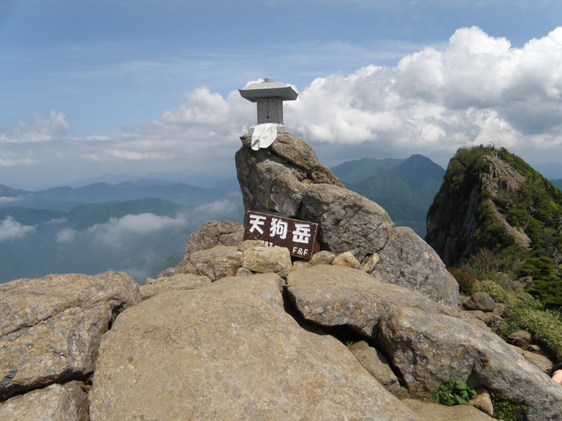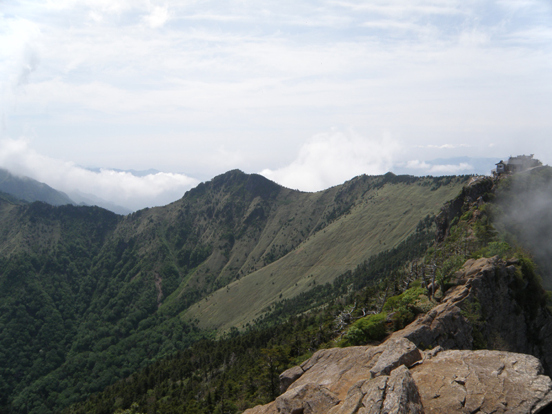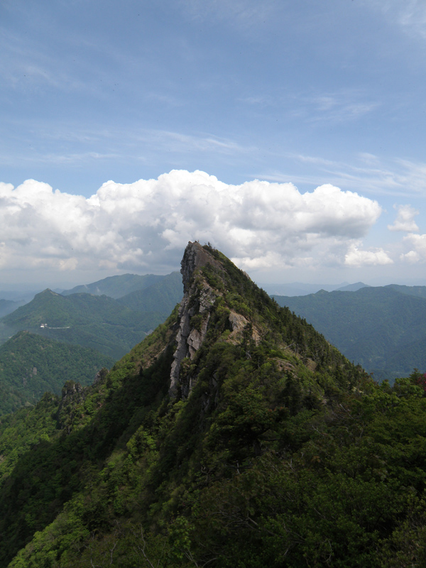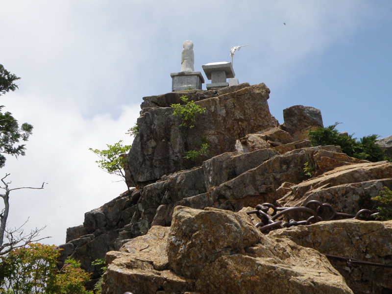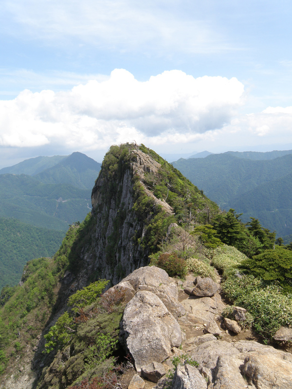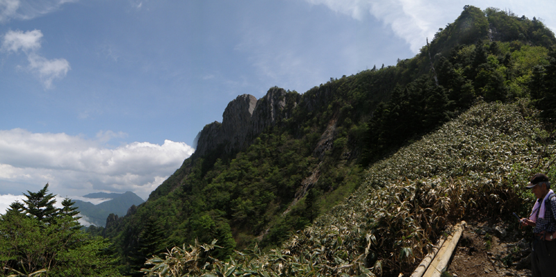 鎖を4mほど下りて、ナイフエッジと言ったら大げさすぎるが、そんな箇所を歩いて行く。 左側は150mくらいありそうな断崖。 強風が吹いたら危険かもしれないが、気分も景色もいい道を歩く。 元会社の人がけっこうビビっていて、意外に時間がかかって到着。 これで西日本最高峰を制覇か!?