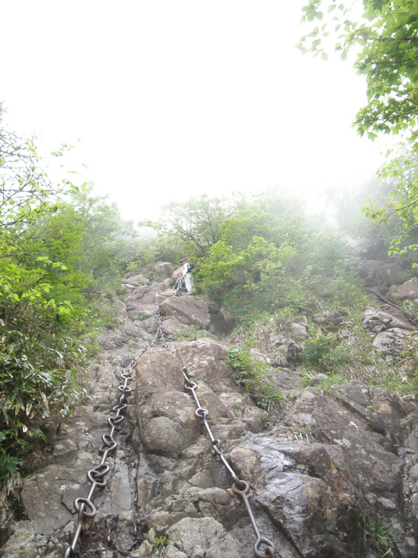 もちろん迂回路もあるけれど、今日はこれを登るのが目的でこの山にきたからやらなくては。 鎖を登ることや、高さは全然怖くないが一つ不安な事が。 それは鎖を繋いである支点がどうなっているのか。 1つの鎖の重さが4kgほど、長さが40cmくらいなので……6000/40*4=600 それが4本くらい下がっているので2.4トンもの重さがかかっている。 きちんと鎖が落ちないようになっているのだろうか。 それだけが不安。