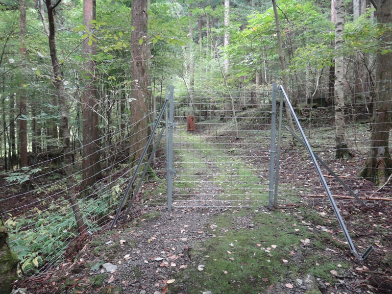そこから集落の跡地っぽいところを通過して林道まで下りてきた。 林道を30分くらい歩いて、住友フォレスターハウス方面への登山道に下りていく。 鹿除けの鉄柵を通り抜け、無事下山。