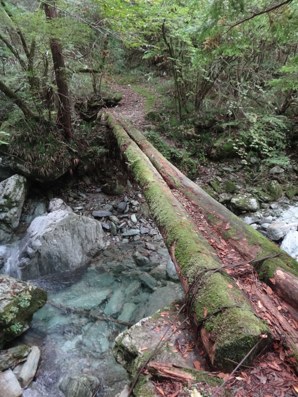 最後に下山で使ったのが結構前なので、どんな道か忘れてしまっている部分が多い。 出だしすぐに、丸木橋がある。 これが微妙に湿っていて滑りそうで怖い。
