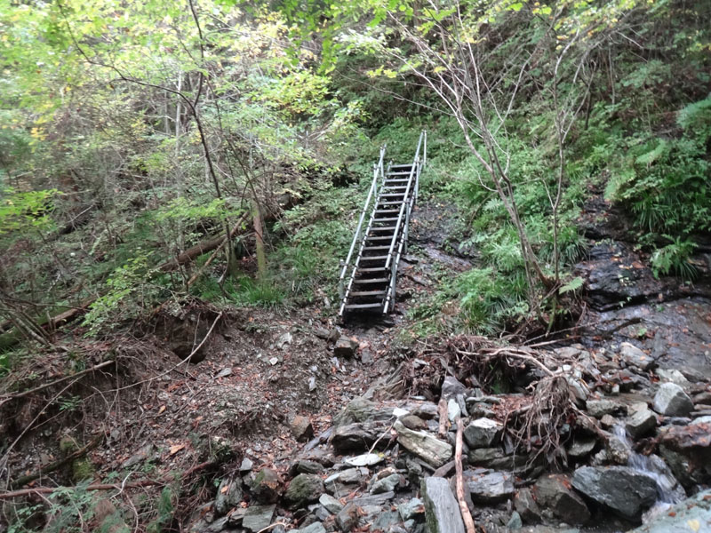 鉄塔の真下を通り、鉄パイプでできた立派なはしごを降り、渡渉。 少し登り返すけど、また立派なハシゴを下ると、川の音が大きくなって、ゴールが近いのを感じる。