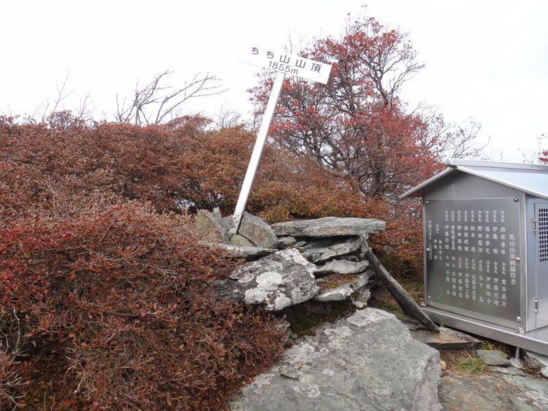ちち山分れから先は、この時期は歩きにくい笹に覆われた道だった。 笹の根に足を滑らせながら歩いていき、ちち山へ到着。
