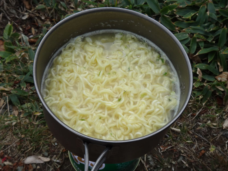 少し進んで長めの良い場所でお昼にする。 お湯を沸かしてラーメンを作って食べて、おにぎりを食べて、温かいお茶を入れて飲む。