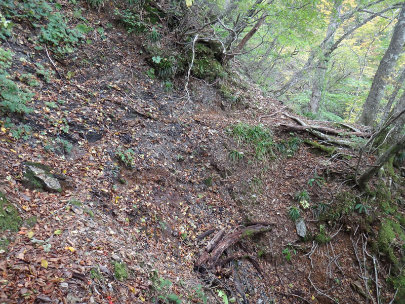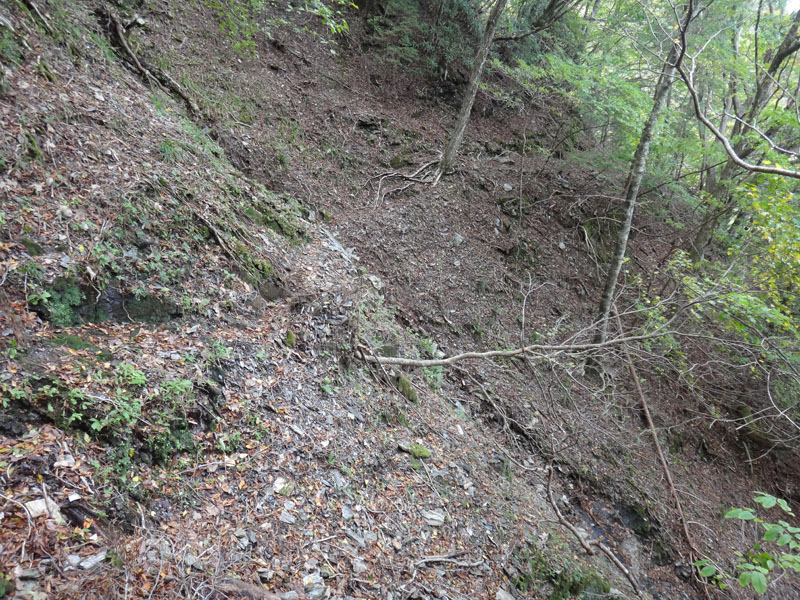冬場に道を見失った場所は、そのまま道沿いに下りていき、何度か折り返して行くのが正解だった様子。 しばらく歩いていると、崩壊しかけた谷間を抜ける箇所が何度もあった。 これは冬場道がわかってても、通るのは困難だな……