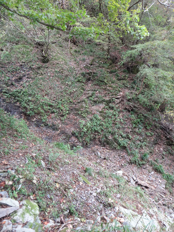 仕方がない、少し先に進んで、広そうな場所で休むか。 少し歩いた斜面の途中が広くなっていて、濡れる要素もなかったので、そこで休憩。