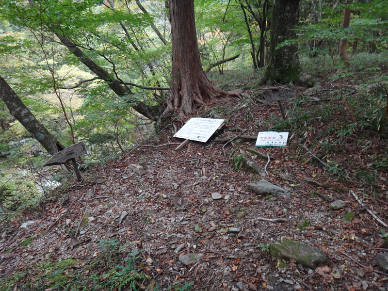 インスタントラーメンを作って荷物をまとめて下山する。 一ノ谷越まではすぐに到着。 一ノ谷越の50mくらい手前で、謎の荷物を発見した。 ザックと上着、登山口、靴下が置かれていた。 ザックと上着くらいだったらトイレかなとか思うのだけど、登山靴と靴下?? あたりを見回したが人らしき影や物音は無い。 靴下まで脱ぐって、まさか首つりでもしてるんじゃないかと、あたりを見回したがそれらしきものも見当たらなかった。