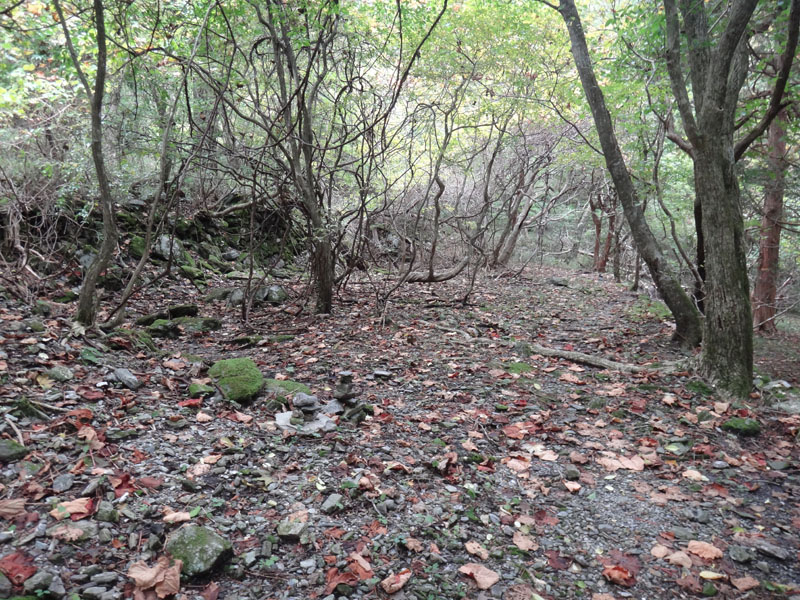 気を取り直して稜線を歩いていく。 正規の登山道は、途中で右手の樹林帯に入っていくのだけど、入る場所が分からなく、稜線が岩場に変わるギリギリの場所までやってきてしまった。 30mくらいの岩場なので、このくらいなら、道なき樹林帯でも迂回できるかな。 トラヴァースルートが使えないので、帰りもこの道を歩くことになる。 なので、なるべく小幅で、なるべく真っ直ぐ下りないように、登り返しやすいように道を作りながら下りて行った。 岩場は上手く迂回できた。