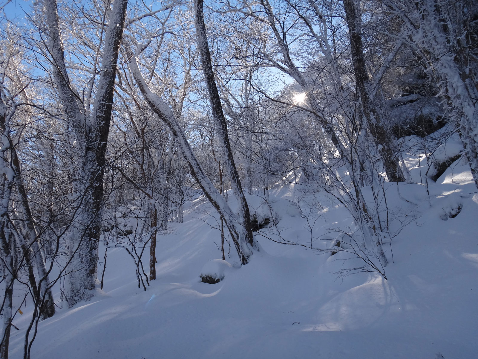 樹林帯の尾根道に苦労しながら歩いていく。 そして、夏だと笹原の箇所が近づいてきたが、その直前で、スノーシューのトレースが無くなっている。 ここで引き返したんだな。 さすがのスノーシューでもきつかったか……