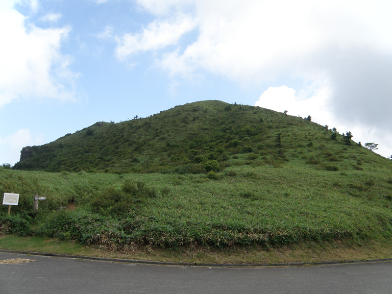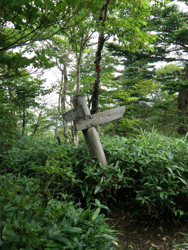 ピーク付近の岩場を西側から巻くような感じで歩き、木の標のあるところまでやってきた。 ここがピークなので、ここから先は下る。 この下り道はめちゃめちゃ印象に残っている。 トラヴァースする箇所があるのだけど、足元が崩れるので何かにつかまりながら歩かなくてはならない。 だが掴むものが植物しかない。 木は生えておらず、雑草を掴むのだけど、掴む対象となるのが、アザミ。 アザミの茎や葉にはとげがある。 痛みに耐えながらトラヴァースした思い出が……