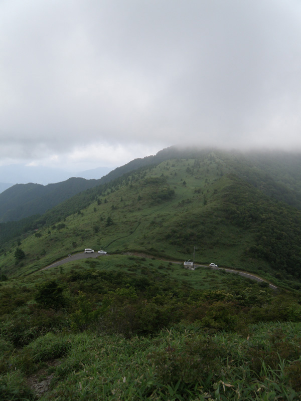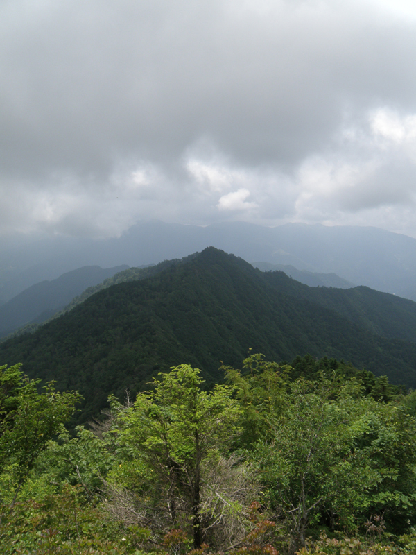 兵庫から来て矢筈山を目指しているという3人パーティを抜かして、あっという間にサガリハゲ山分岐へ。 やっぱり相当濡れたな。 しかもこのレインコート、登山用じゃないのでとても蒸れる。 蒸れて、内側が結露し、それがズボンにつき、ズボンが濡れる。 しかもかなり不快。 脱いだらズボンがびしょぬれになるだろうけど……レインコート脱ぐか。