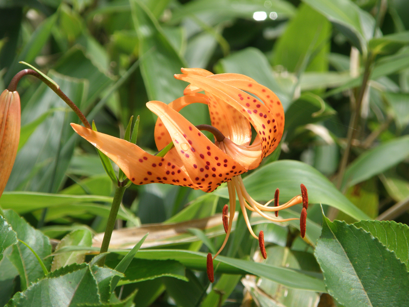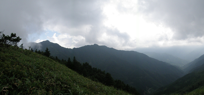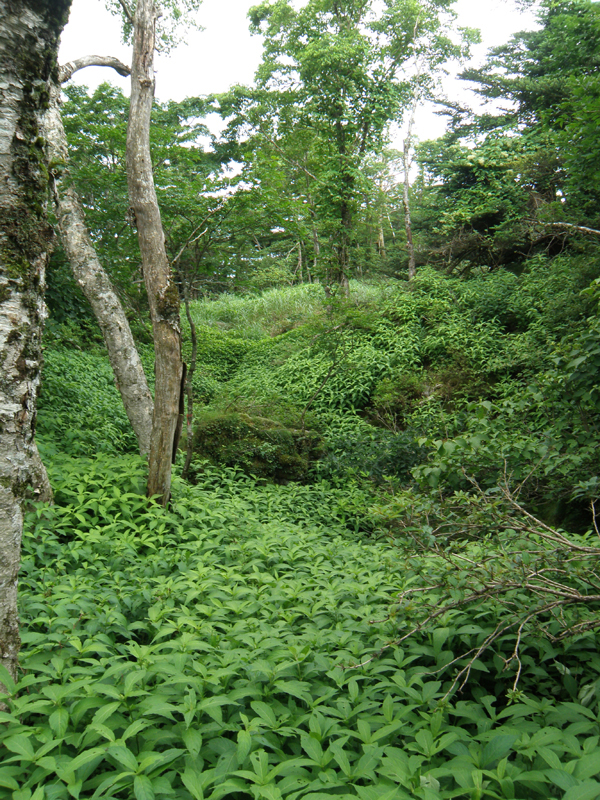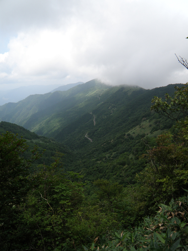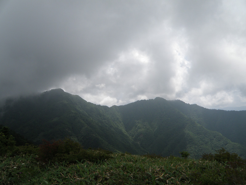 そこを越えたらロープが張られているものすごい急な下り道。 足元はぬかるみまくり、傾斜もすさまじい。 ロープなしじゃ無理だなこれ。 ロープの終端まで行って、そこからはトラバース。 しかしここがまた道が悪い。 道というか、道がない…… 急傾斜な斜面を無理やり横切る感じ。 足を滑らせたら下に落ちそうだ。 しかもそのトラバースでさらなる試練が…… 両手を離しては歩けないような急斜面を横切るのだが、手がつかむものは草。 しかし頑丈な笹はなく、ひ弱そうな草と、オニアザミらしきトゲのついた草が生えているだけ。 トゲのついた草は痛すぎて当然素手じゃ握れない。 ひ弱そうな草を頼りになんとか恐怖の5mを進む。 いやー、恐ろしかったなここ。