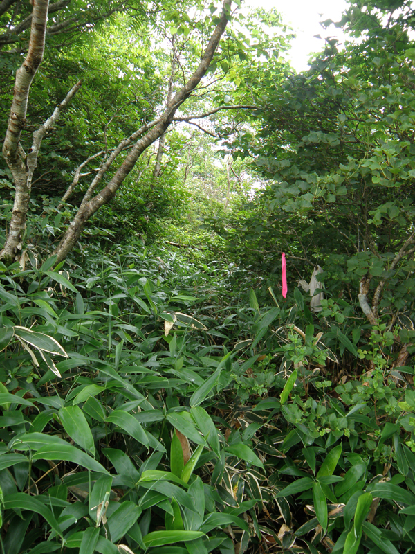 サガリハゲ山分岐直後、激しい悪路が始まった。 出だしがこれとは…… しかし少し歩いたら、道はマシになった。 が、あまり人が歩いていないためしっかりとした踏み跡はないし、笹が深くて歩きにくいし…… ピンクリボンを目指して適当に歩けそうな場所を歩いて進む。