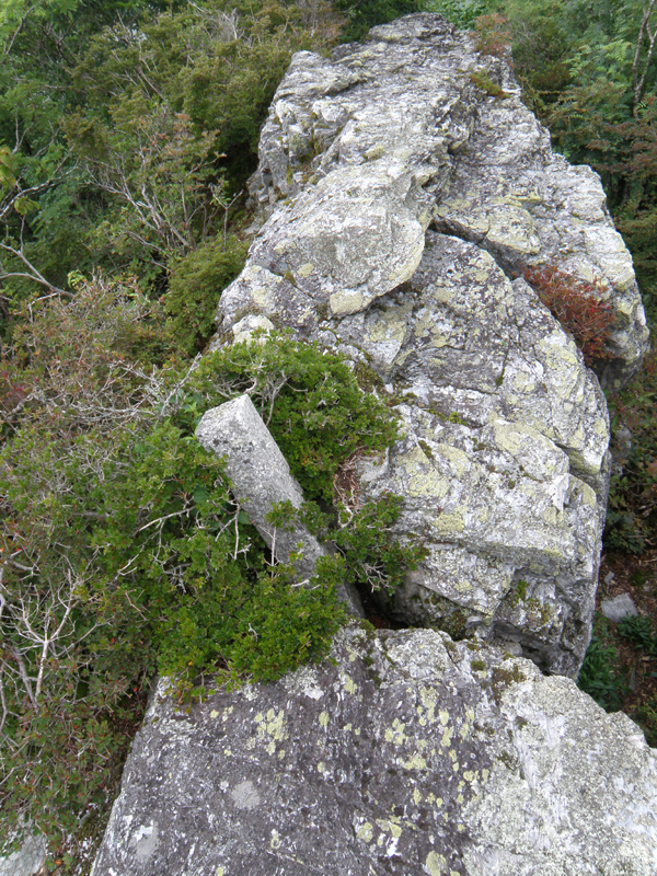 草木の種類は全然わからないのだが、胸の高さくらいのつつじみたいな木がたくさん生えている道なき道を無理やり降りる感じ。 西側は断崖絶壁。 その断崖絶壁ぎりぎりを歩く箇所があった。