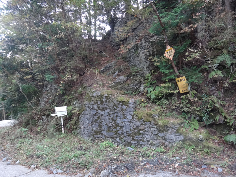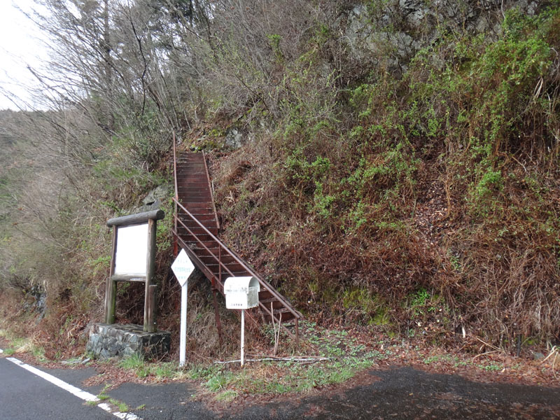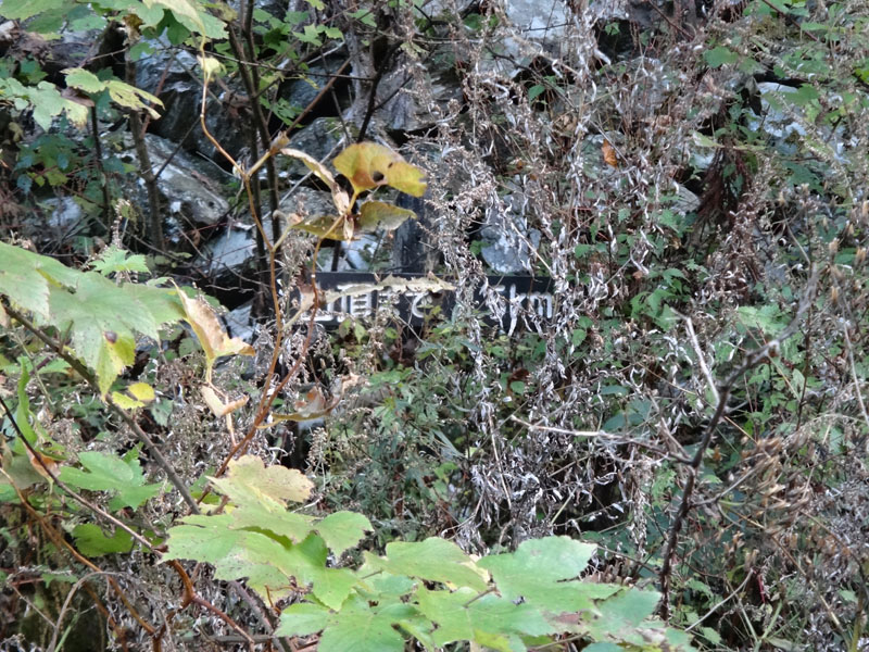 前回探した、ここからの登山口。 林道をそのまま200mくらい歩き、山側の荒々しい崖が終わった後の茂みの中に登山口がある。 場所は知っているのですぐわかったが、初見でこれは見つけられないだろう…… 一応看板はあるのだけど、看板を発見することすら困難。