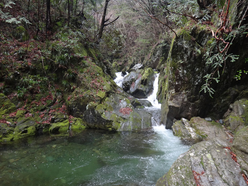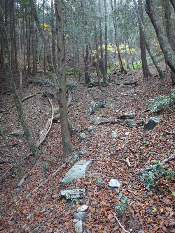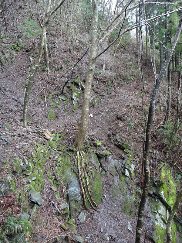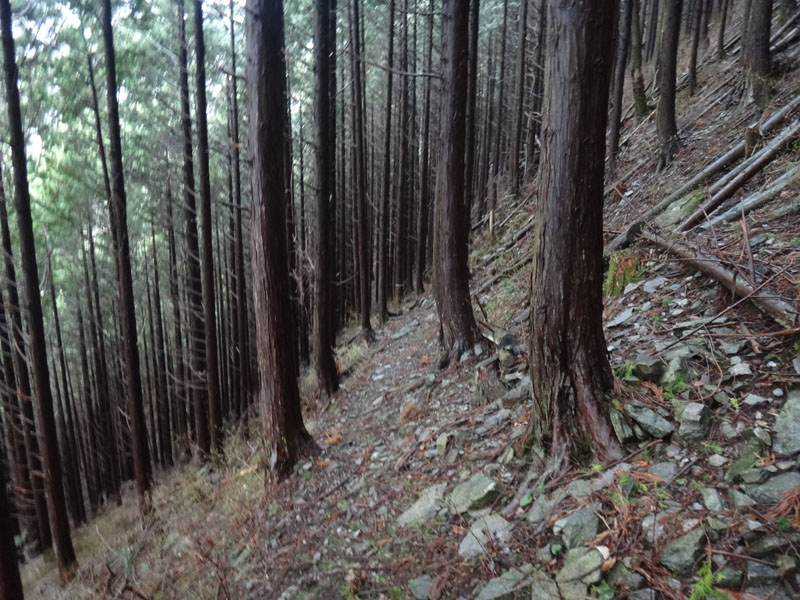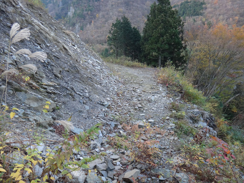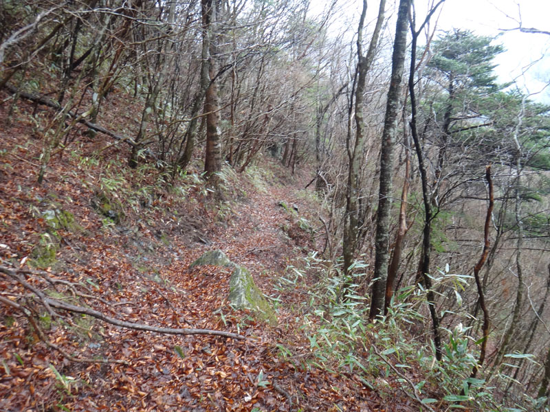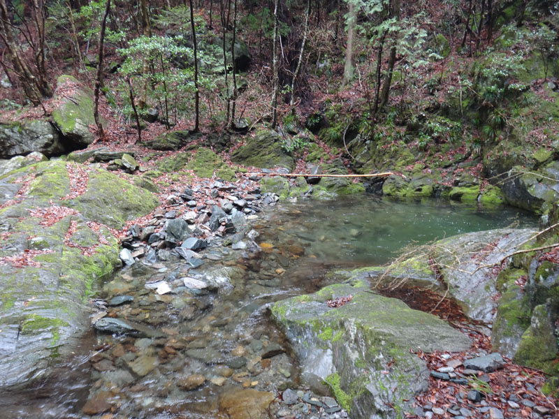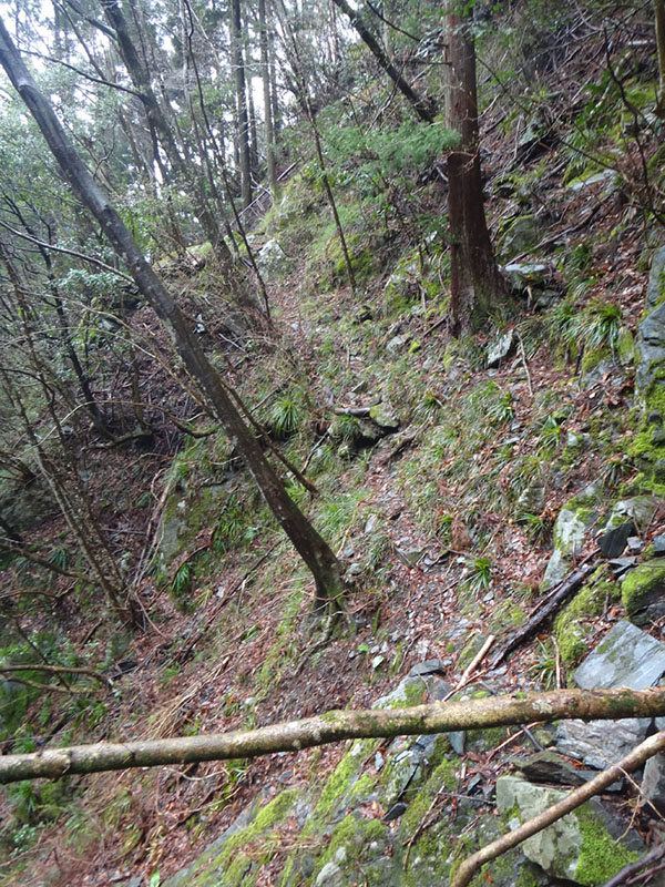 道自体は荒れてるけど明瞭で、どんどんと下っていく。 途中で杉林の中を急激に高度を下げる区間があり、渡渉ポイントへ。 雨で川の水が増えており、2歩の渡渉だけど、滑りそうで怖かった。 その後は沢を左下に見ながら歩いて行く。 細くて危なそうな箇所がいくつか。 そして2つ目の渡渉ポイントがあった。