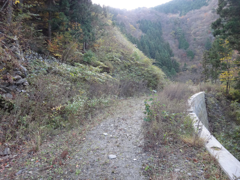 道はほとんど一直線に登って行く。 が、それほど急な道でもない。 川の音を聞きながら登って行き、林道に合流。 登山口の林道をそのまま車で4kmくらい走って行けばここまで来れるみたい。 ただ、林道はここで終点、ここから先は工事もされてないみたい。