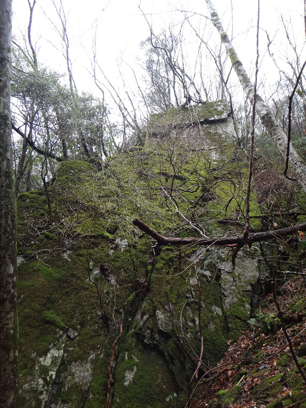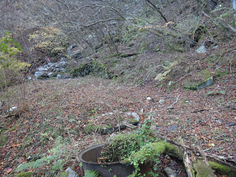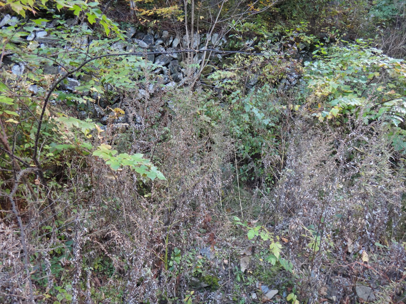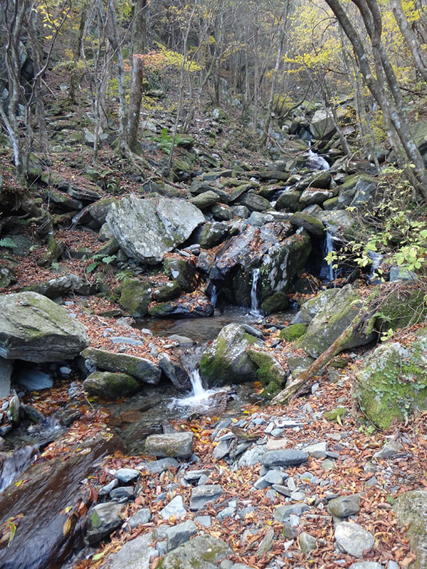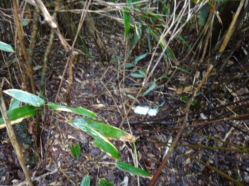 先週歩いたばかりの道を歩いて行く。 松林を抜けて渡渉ポイントを何箇所か通過。 天気が悪いため、先週は見えた景色が全然見えない。 すぐに峨蔵越まで到着。 さぁここから捜索が始まる。 探すのにザックは邪魔なのでどこかに置いておこうかなと思ったけど、峨蔵越は木々も無く、雨が直接当たるのでここに置いておくのはやめておこう。 少し進んだ、適当な場所に置こうと思って、ザックを背負いながら捜索を始める。