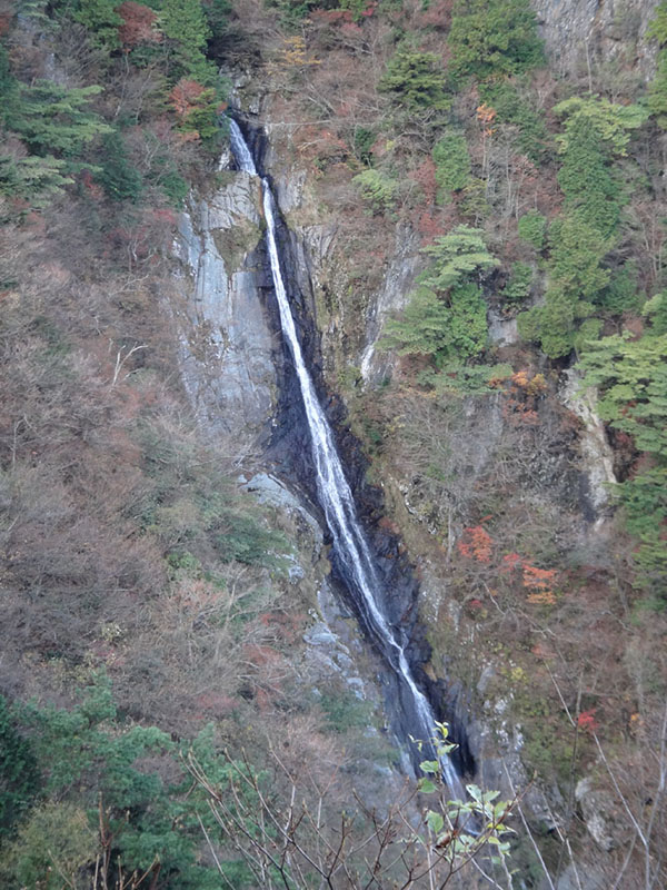 登山口から再び山の中に入って行く、少し歩いたら敬天の滝の展望所があるので、そこで休憩。 滝は紅葉に包まれていて、一直線に流れ落ちていて美しかった。