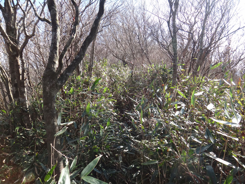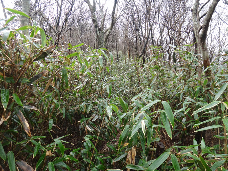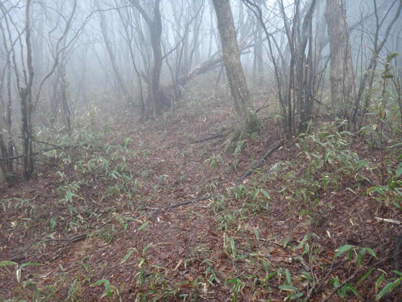 帰りの道も、峨蔵越までは笹の道を苦労しながら歩いていく。 帰りの峨蔵越にも誰もおらず、そのまま北斜面の登山道を下りて行く。