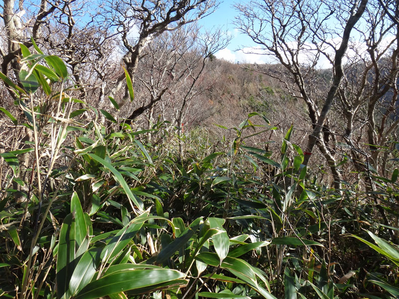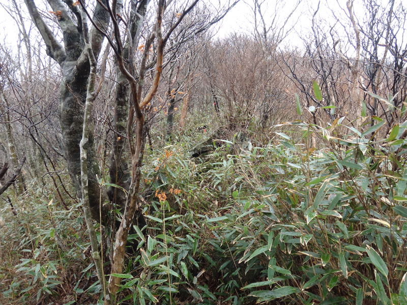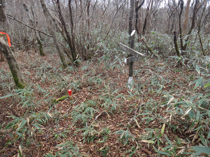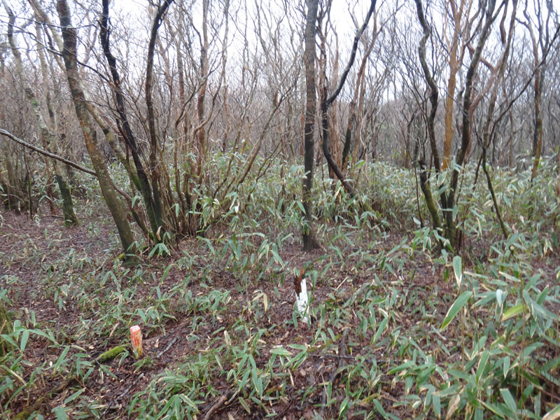 動物とかが折れるようなものじゃないし、人間が折ったっぽいのだけど、誰が折ったのだろうか? 折れたはずの上の部分も見当たらないし…… これじゃ分岐点知っている人じゃないとわからないな。 赤星山へは道がある程度見えているのでいいけれど、ハネズル山方面には踏み跡すら見えないような感じになってしまっている。