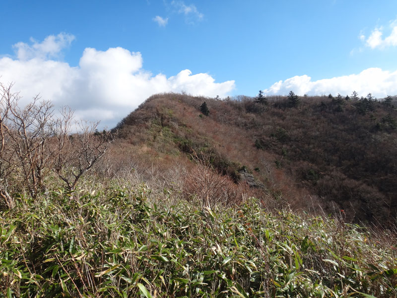 歩き出してすぐ、笹の道に変わる。 笹は腰~胸くらいの高さまであり、足元が全然見えない…… インターネットでルートを調べた時も、笹のことは書かれていたけど、こんな道だったのか…… 少し行くと展望が開け、目の前には1307mの小ピークが、後ろには二ツ岳が見える。
