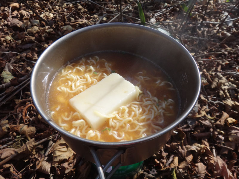 赤星山分岐でお昼ご飯。 インスタントラーメンを作り、今日は餅を持ってきているので、力ラーメンにして、エネルギーを補給する。