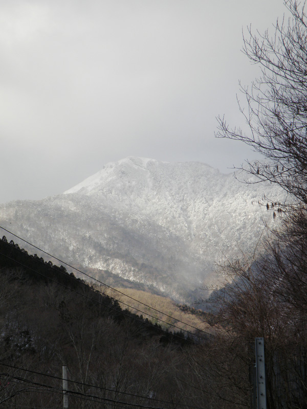 縦にワインディングするようになってから雪の量が増えてきた。 けどまだまだ行けるな。 後ろを振り返ると木々のすき間から、山頂が真っ白になった塔丸が見える。
