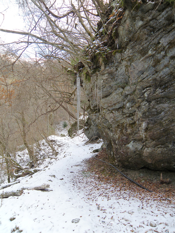 さて、ここから登山道だ。 誰も歩いていないし、携帯も圏外なので気をつけていかなくては。 この付近は積雪もわずかで、沢沿いの道をゆっくり登っていく。 途中2mほどの巨大つららがあった。 落ちてきたら、マンガみたいに突き刺さりそうだ。 先端は鋭いし、かなりの重さがあるだろう。