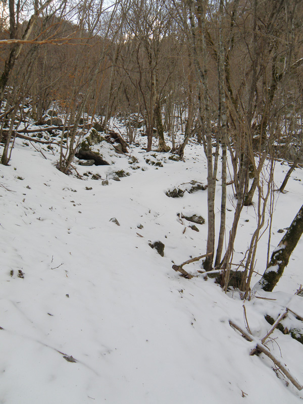 細い登山道を歩いて、緩やかに登っていく。 一部細く崩れている部分もあるが、過去3度ほど歩いている道なので大丈夫。 ただ、初めて歩くんだったら、テープとかがあまり巻いてないので間違えるかも。 まぁ国体橋までは間違っても、沢沿いをはずさなければたどり着けるだろう。 雪は足首くらいまで。