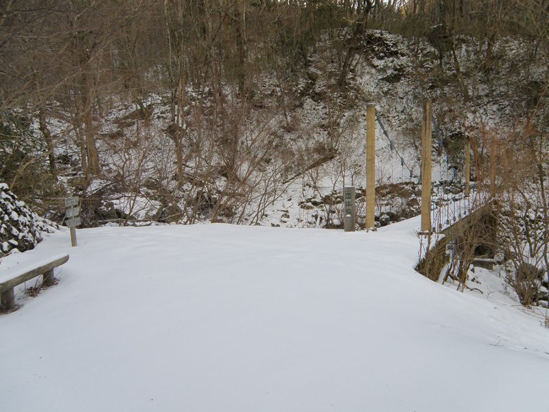 橋は、工事用の板が敷いてあった。 工事関係者が足元を踏み抜かないようにだろうか。 それを利用させてもらう。 反対側に渡ると、けっこう雪が積もっていた。 さて、登山開始。 登山口前まで資材が置いてあったが、全て30cmほどの雪に埋もれていたので、しばらく工事してないんだろうな。