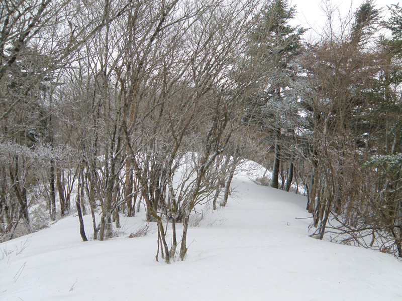 やはり細い斜面を歩くので滑って歩きにくかったが、まぁなんとかなった。 左右にワインディングする道から、前後にワインディングする道に変わる。 この区間で、こういう風に道が変わってくると、稜線が近い。 傾斜が一気にきつくなり、本来の登山道がどこだかわからなくなる。 太い尾根なので、稜線に向かって一直線に歩いていく。 そして稜線に到着。 高ノ瀬方面、丸石方面、どちらにもトレースはついていない。 冬季のこのルート歩いている人を見たこと無いしな……
