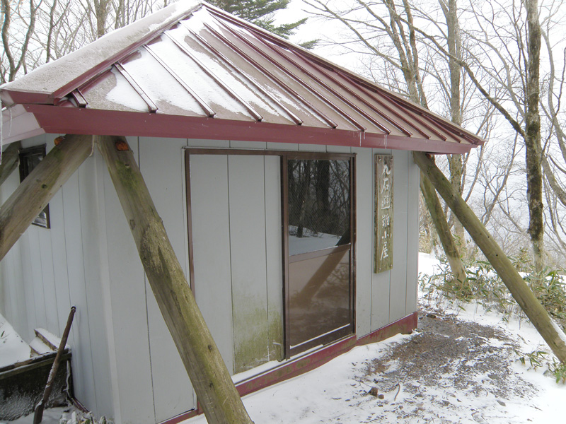 しかし、小屋の中に入ろうとしたが、ドアが開かない。 鍵がかかってるのか? 避難小屋なのに? それとも凍りついてるだけか? サッシの雪を払ったが全く開きそうにない。 ダメだ…… 稜線はかなりの強風で一気に冷めてしまった。 とても寒い…… 小屋の裏側が風を避けられたので、そこでアイゼン装着。 ストックも準備する。 で、パンとおにぎりを頬張る。 国道の時点でけっこう風があったので、稜線はかなり寒いとは予想していたけれど…… ここからけっこう長い距離、稜線歩きをするのでかなり寒そうだ… 気温だけ見たらマイナス6度なのでそれほどでもないが…風が…