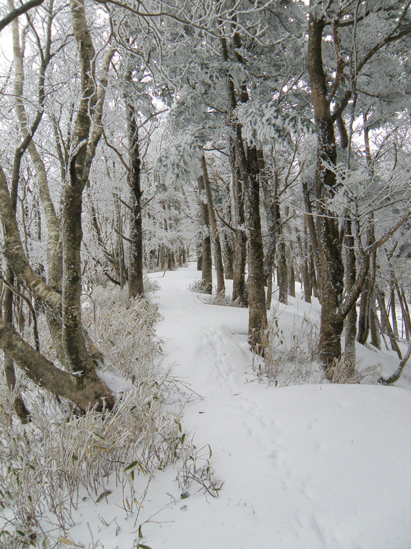 ここからの道は景色が一気にかわった。 綺麗な樹氷の道を歩く、強風の中… 雪もけっこう深くなってきたけれど、下の方が固まってしまっているので、潜っても足首くらいまでしか潜らない。 これじゃ全然ラッセルする個所もなさそうだ…